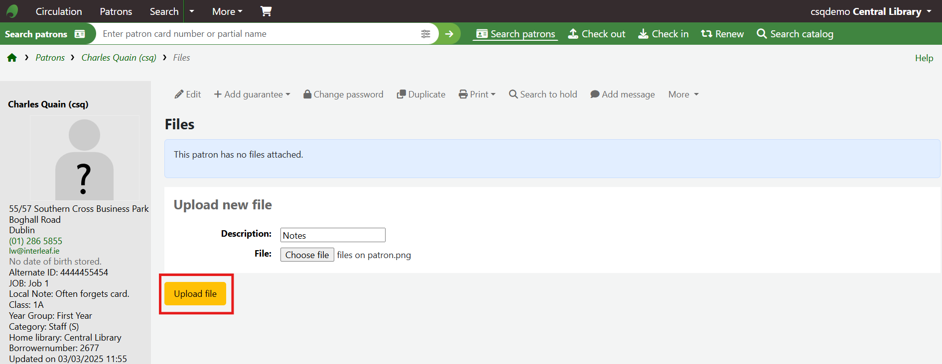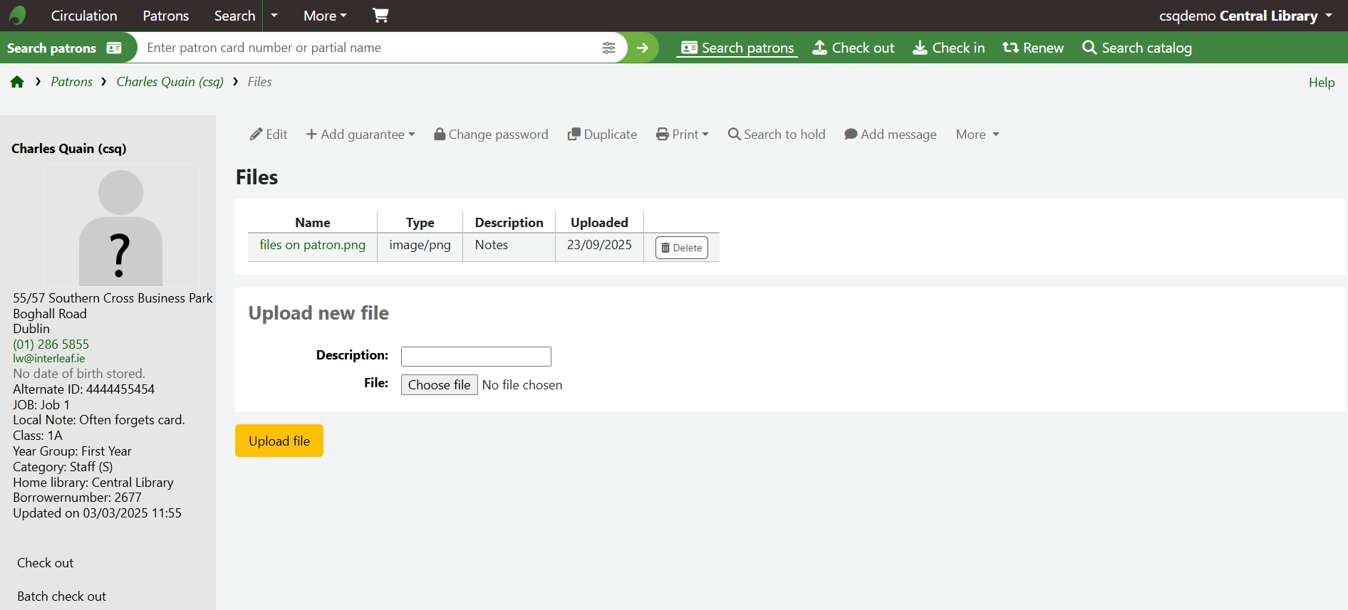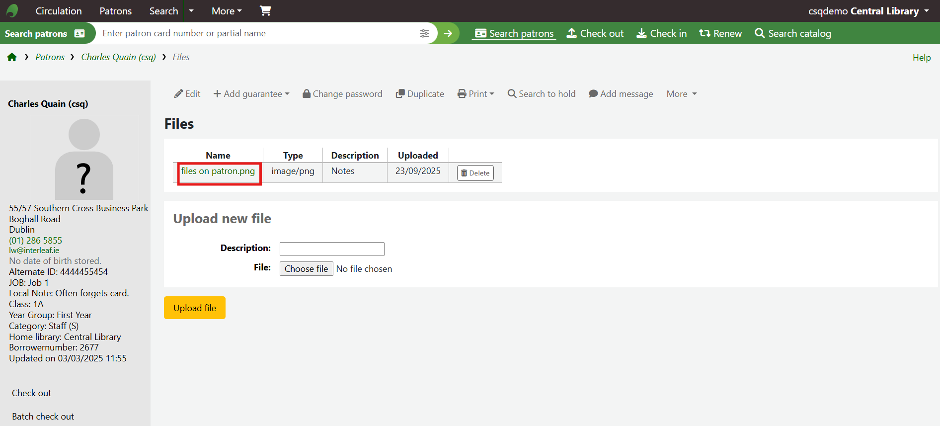 The loaded file will also appear on the patron detail page: