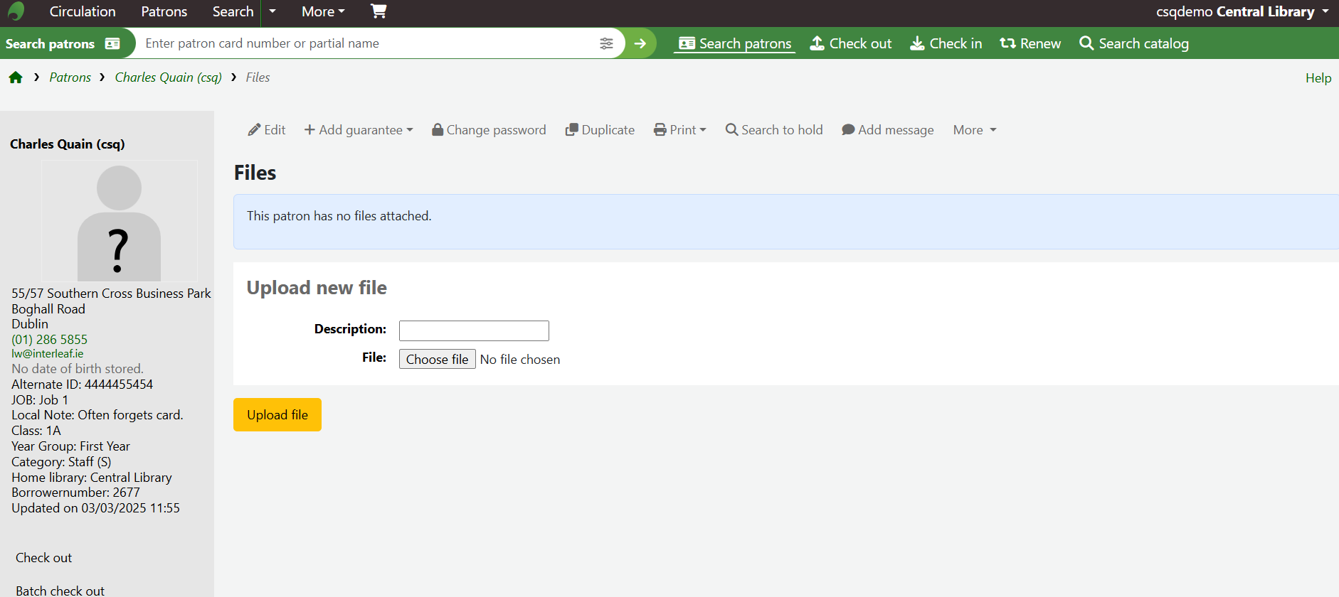 This will take you to a new screen where files already attached to the patron account can be viewed or new ones can be added.To upload the new file, add a description in the Description box and use the Choose file button to select a file from your device to upload. Once the Description field has been filled in and the file has been added, click Upload file.