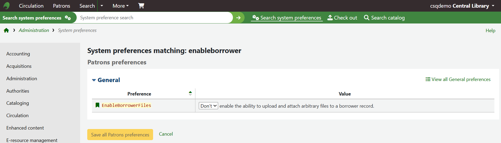 Go to KOHA administration > Global System Preferences and search for EnableBorrowerFiles.