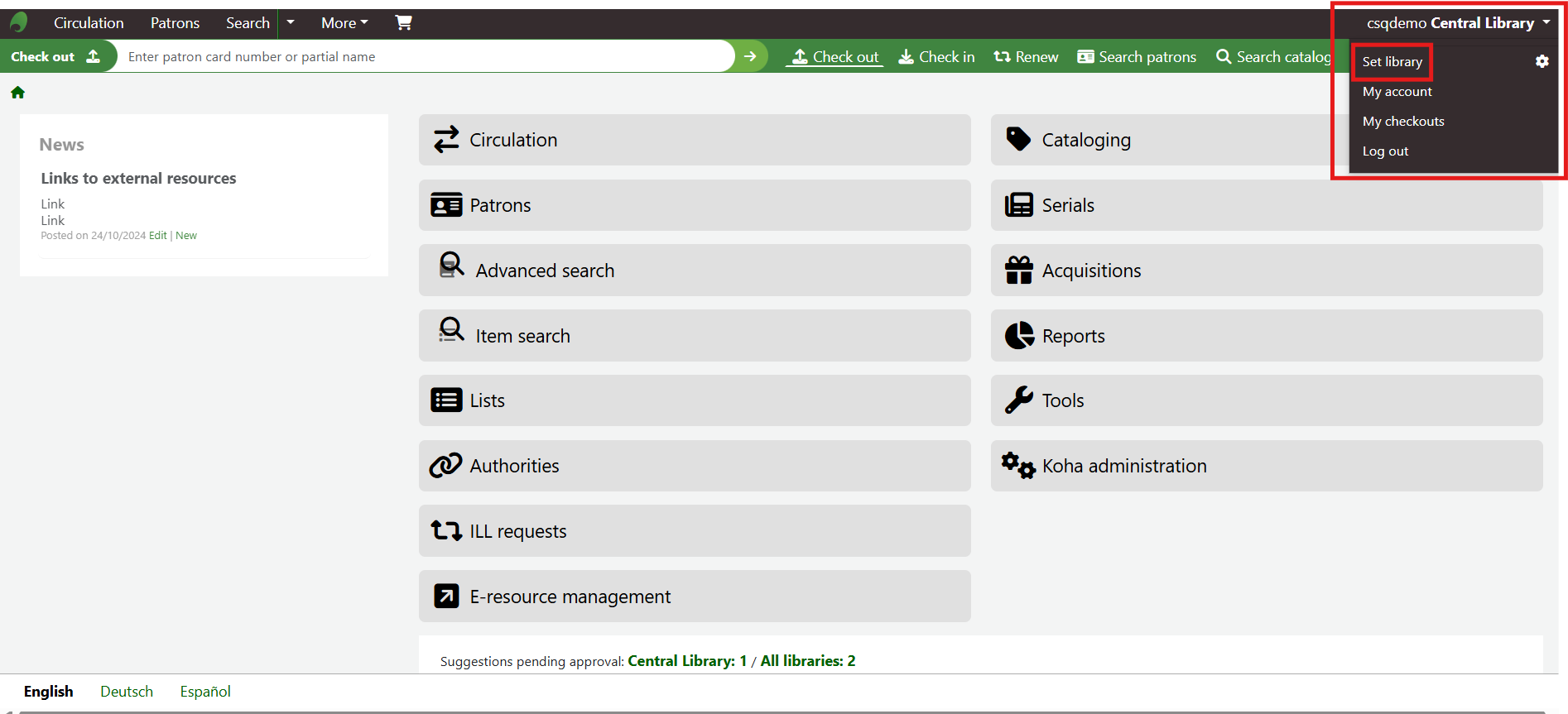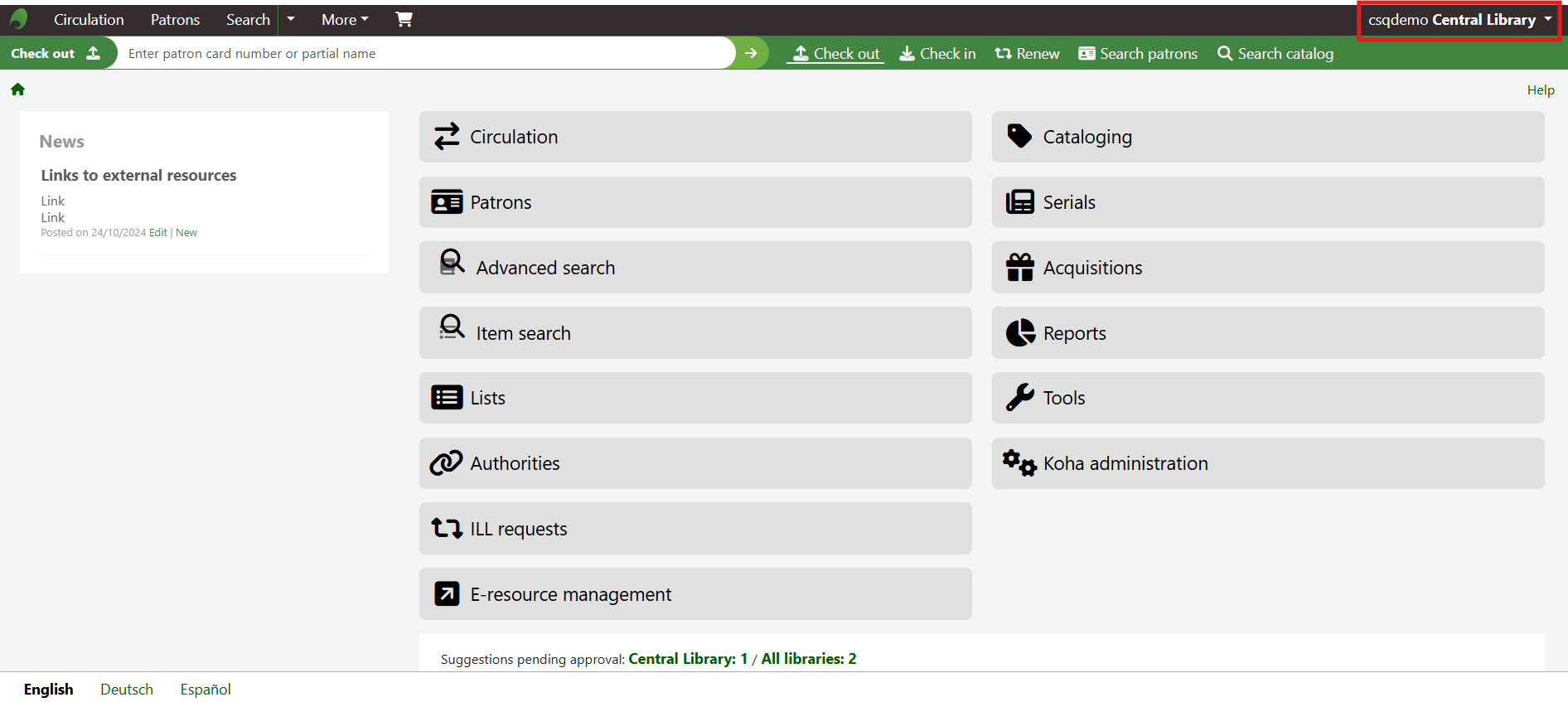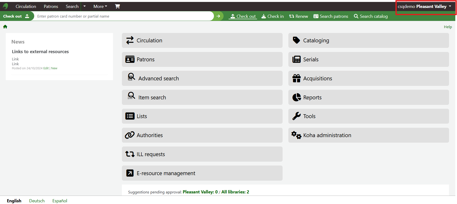 When a patron logs in on Koha, they are automatically logged into their home library. This document will outline how on the staff side a patron can log into a library other than their home branch and how they can temporarily change the branch they are associated with after they have logged in.