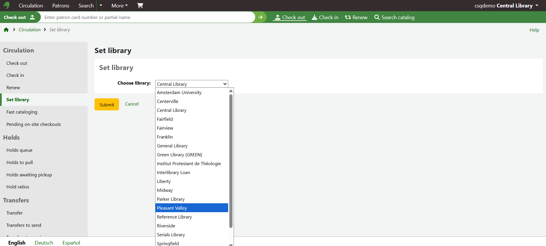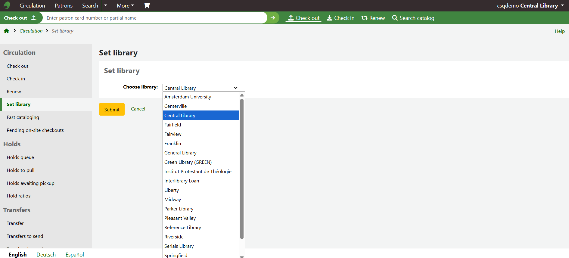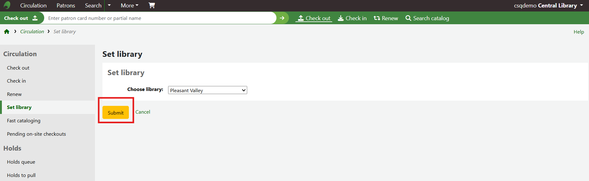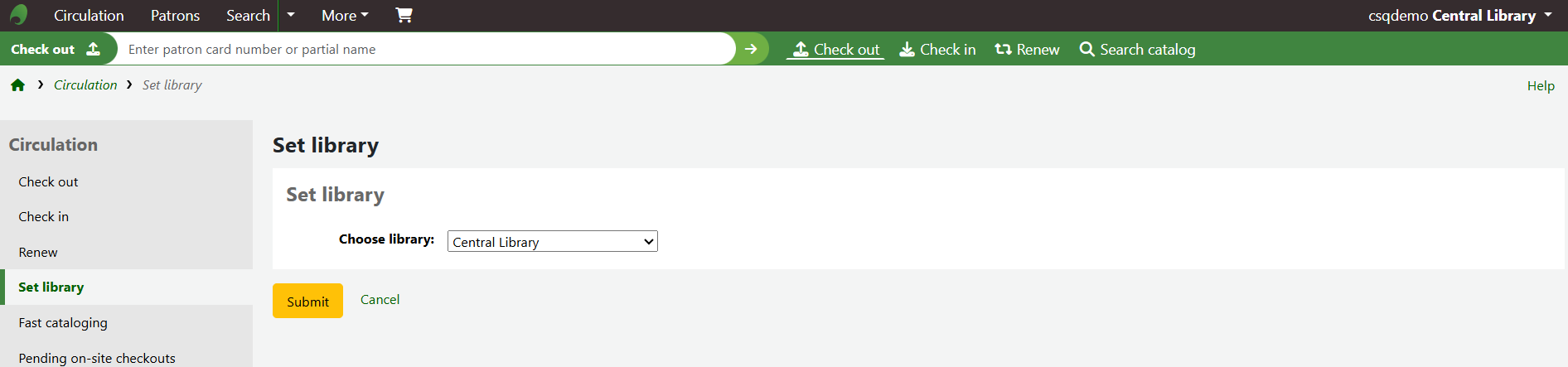 Regardless if the patron has logged into their own home library or a different library on the system, the process for changing the library they are working in is the same.