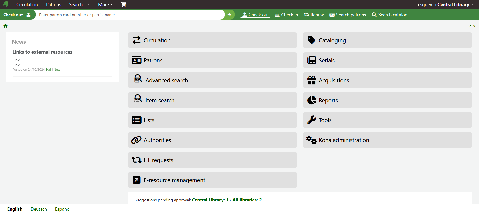 The homepages of the different libraries within Koha will all have the same structure. The only immediate difference will be in the library name in the top right hand corner of the screen. This will always display the library the patron is currently logged into.