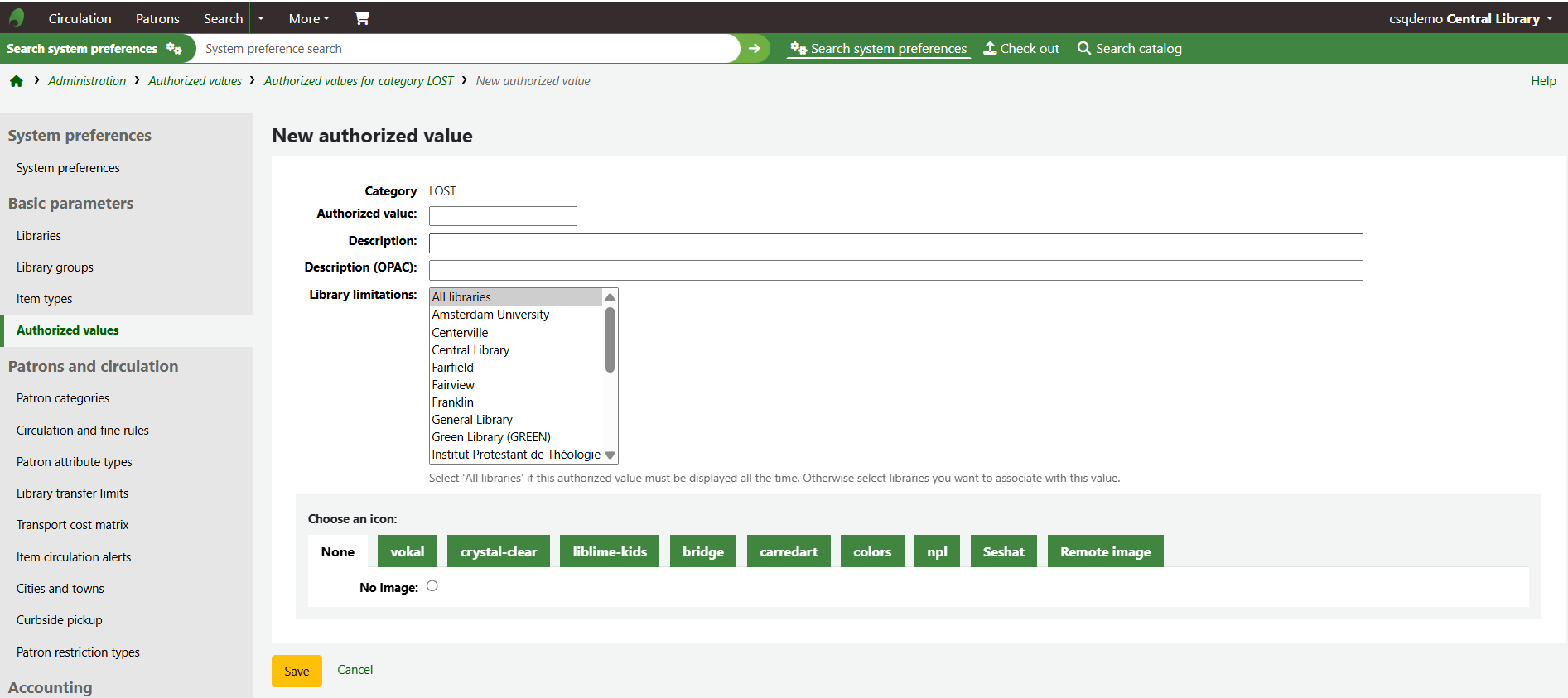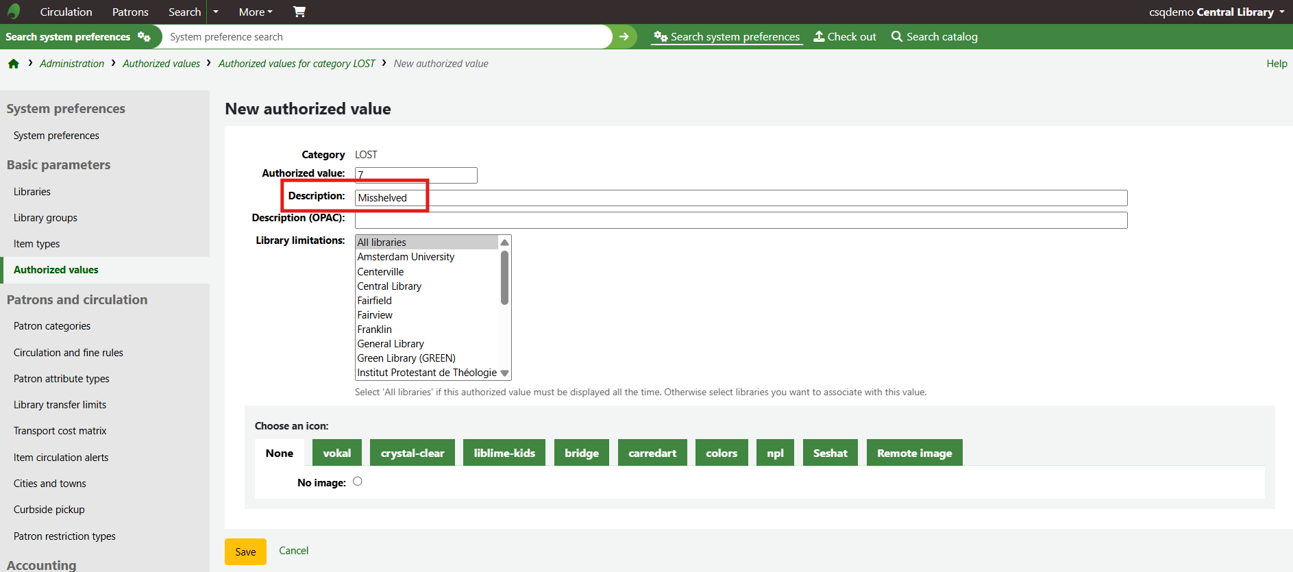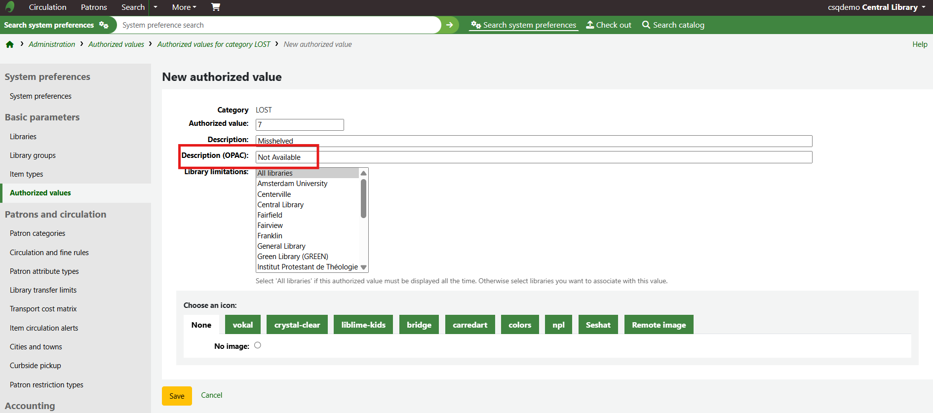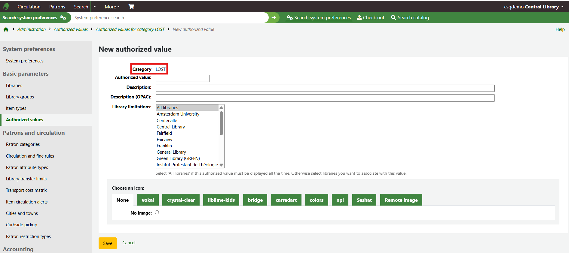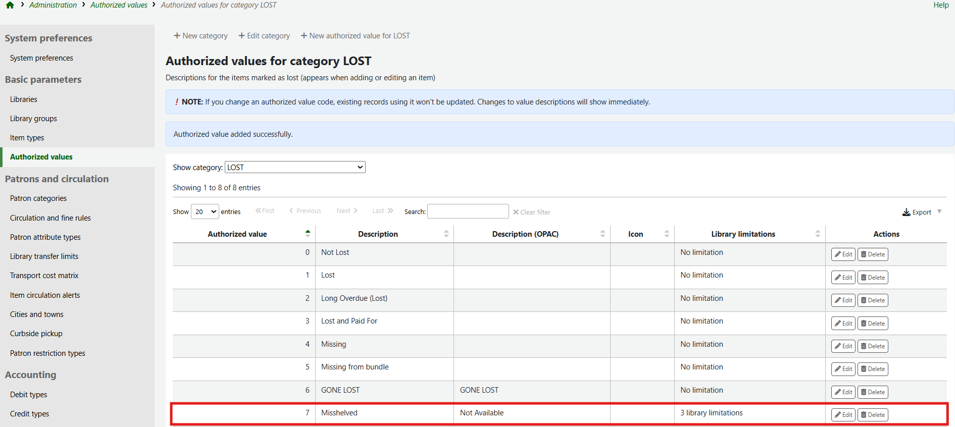 The new authorised value will appear on the list and anywhere the authorised value category is linked to.