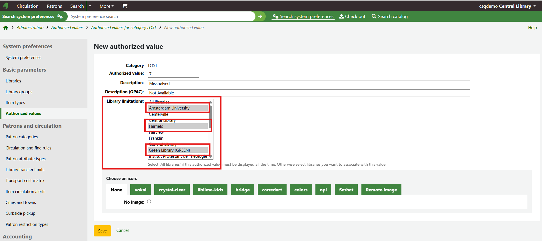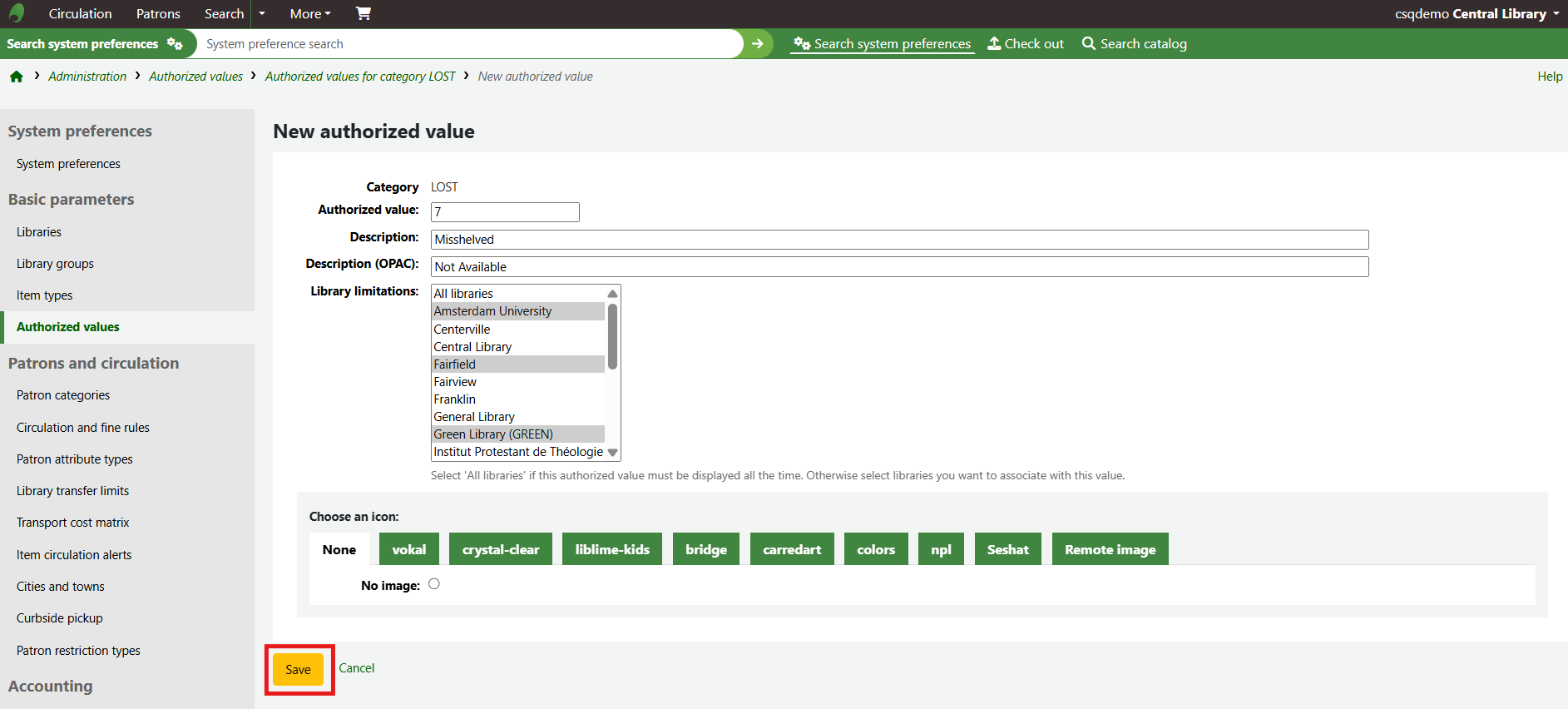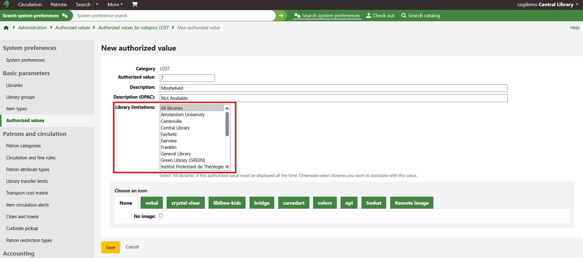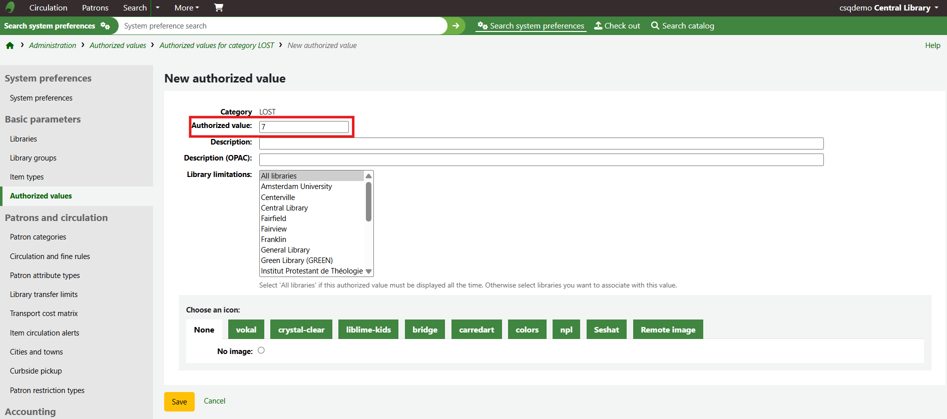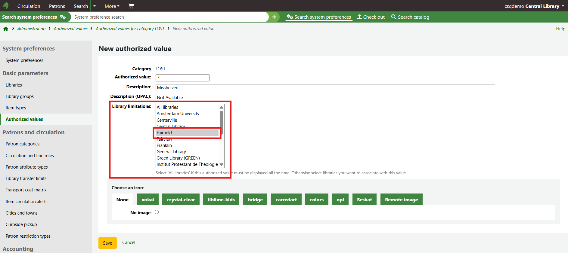 The new authorised value will appear on the list and anywhere the authorised value category is linked to.