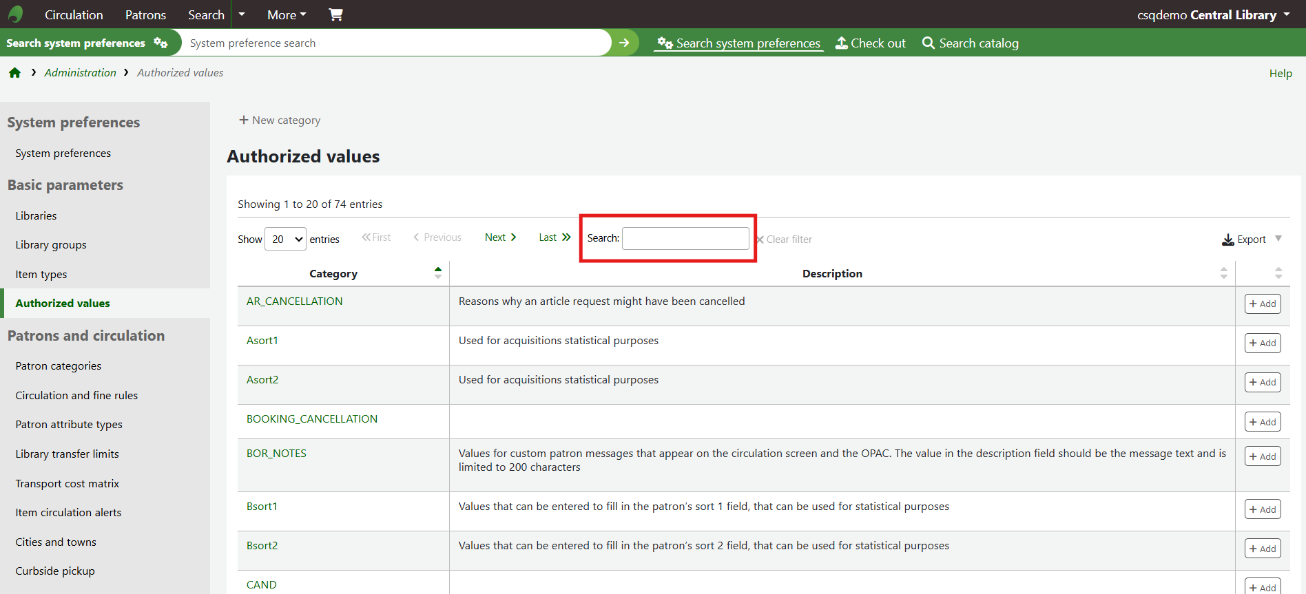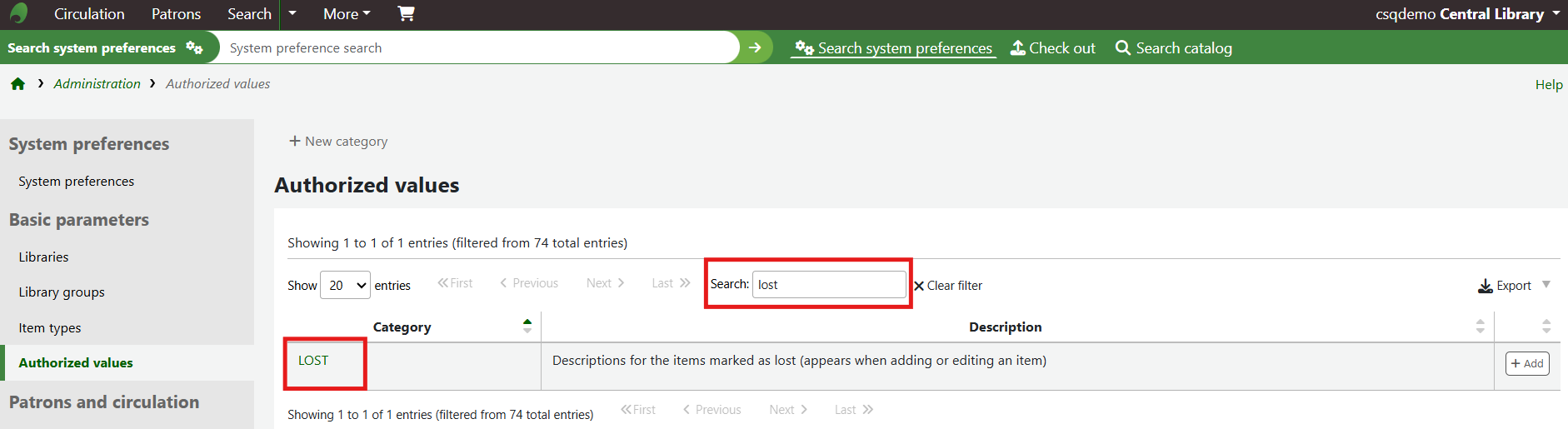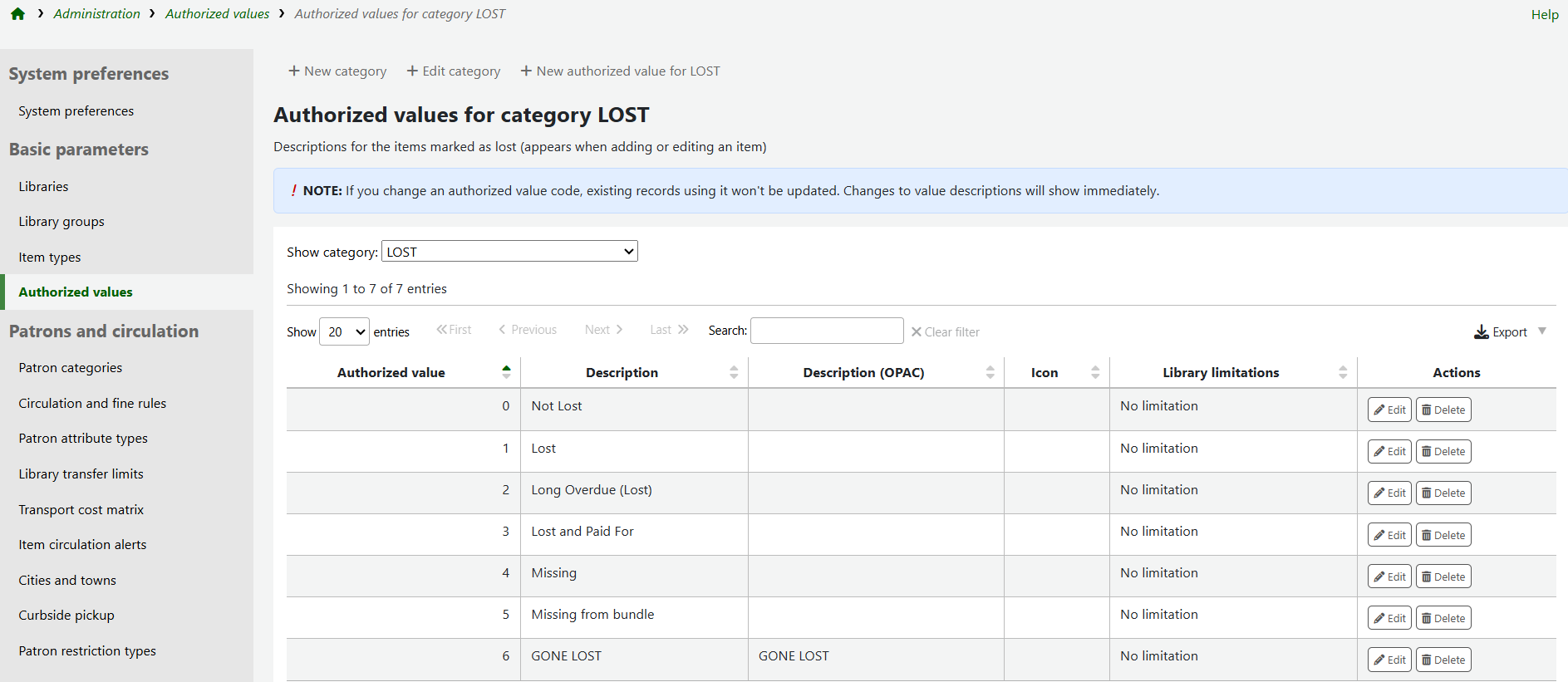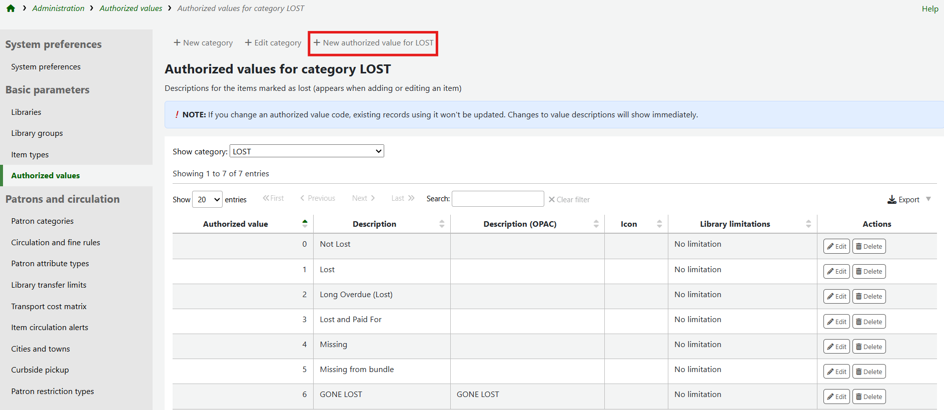 Click the name of the authorised value category a new entry should be created for to see a full list of the authorised values that already exist for the category.