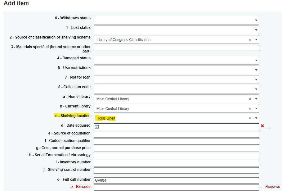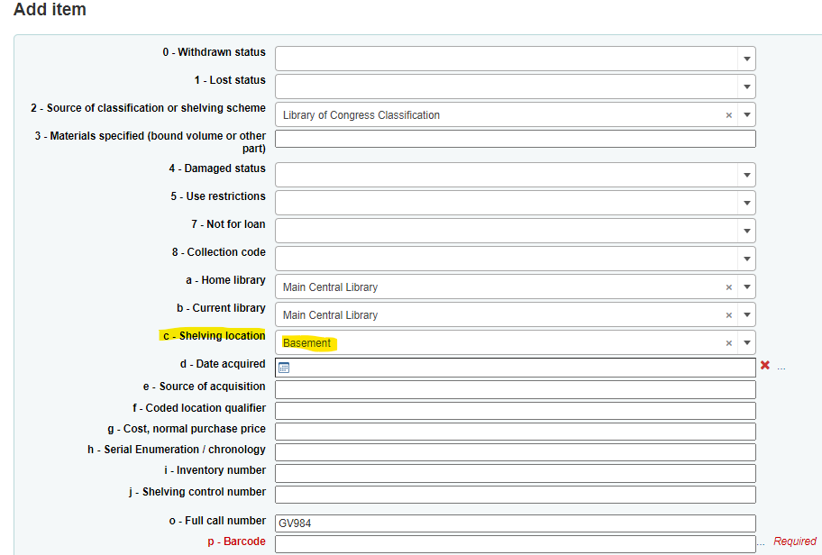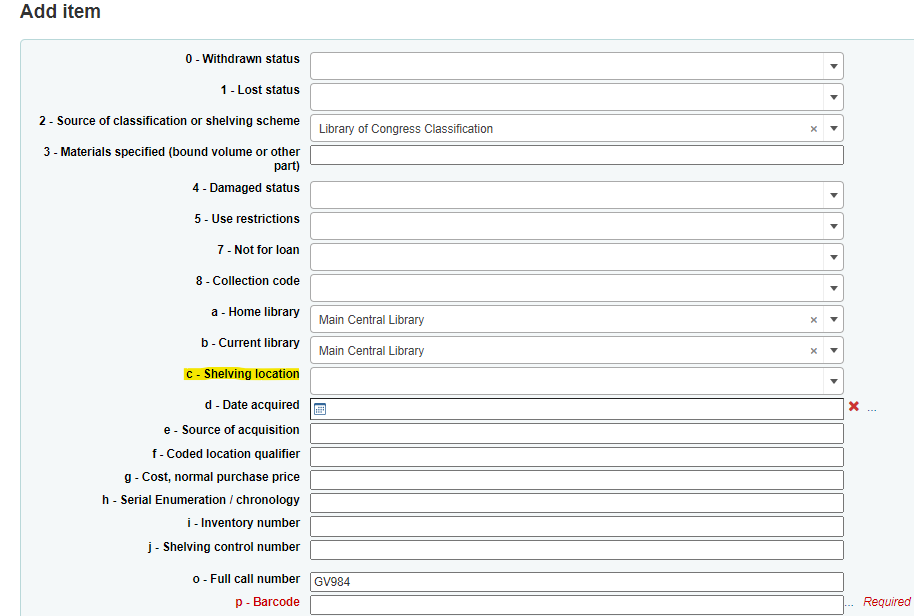 On an item record, go to a field which uses authorised values and click into it. This document will outline the process using the c - Shelving location field, but this process can be applied to any field that uses an authorised value.