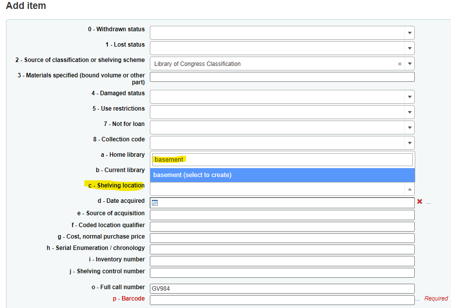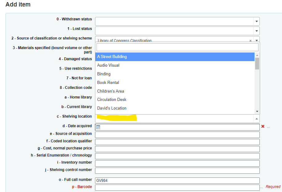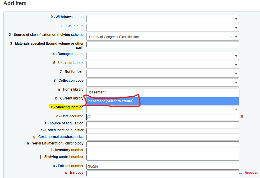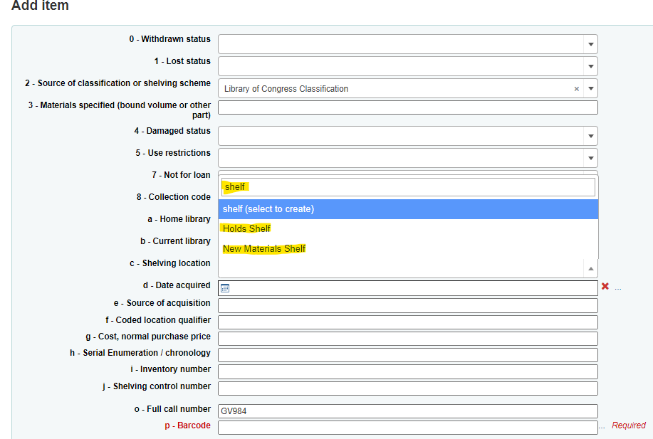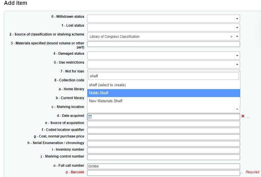 To use one of the existing shelving locations, click on the entry in the narrowed down dropdown menu. The selected location will populate the shelving location field.