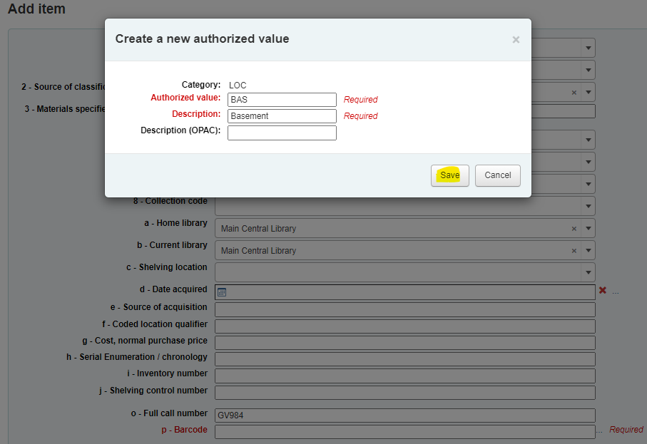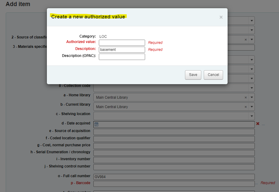 This document will outline how to set up the site so new authorised values can be added to item records during the cataloging process.