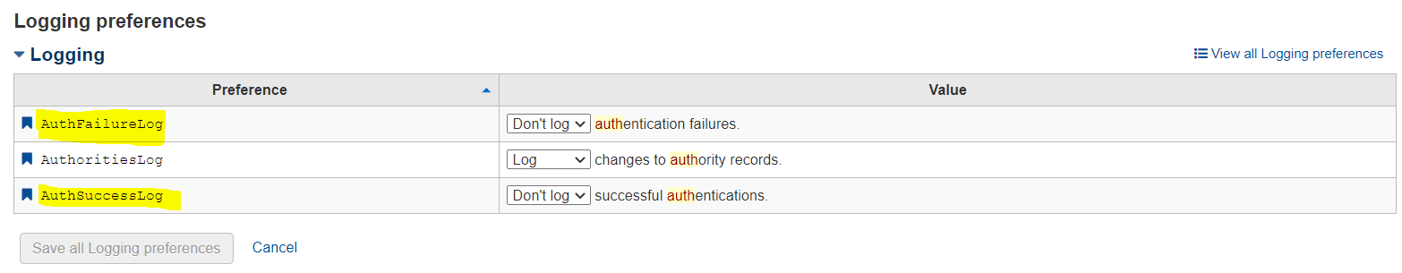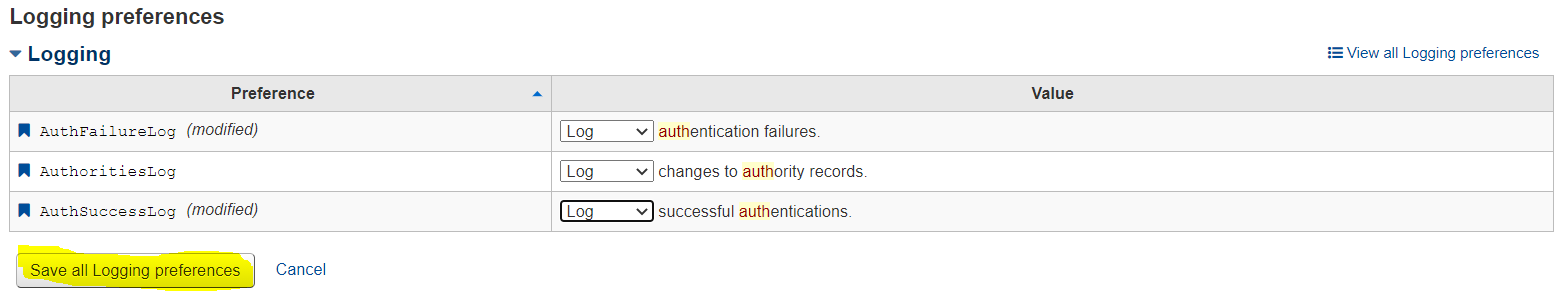 After setting the appropriate system preference(s) click Save all Logging preferences.