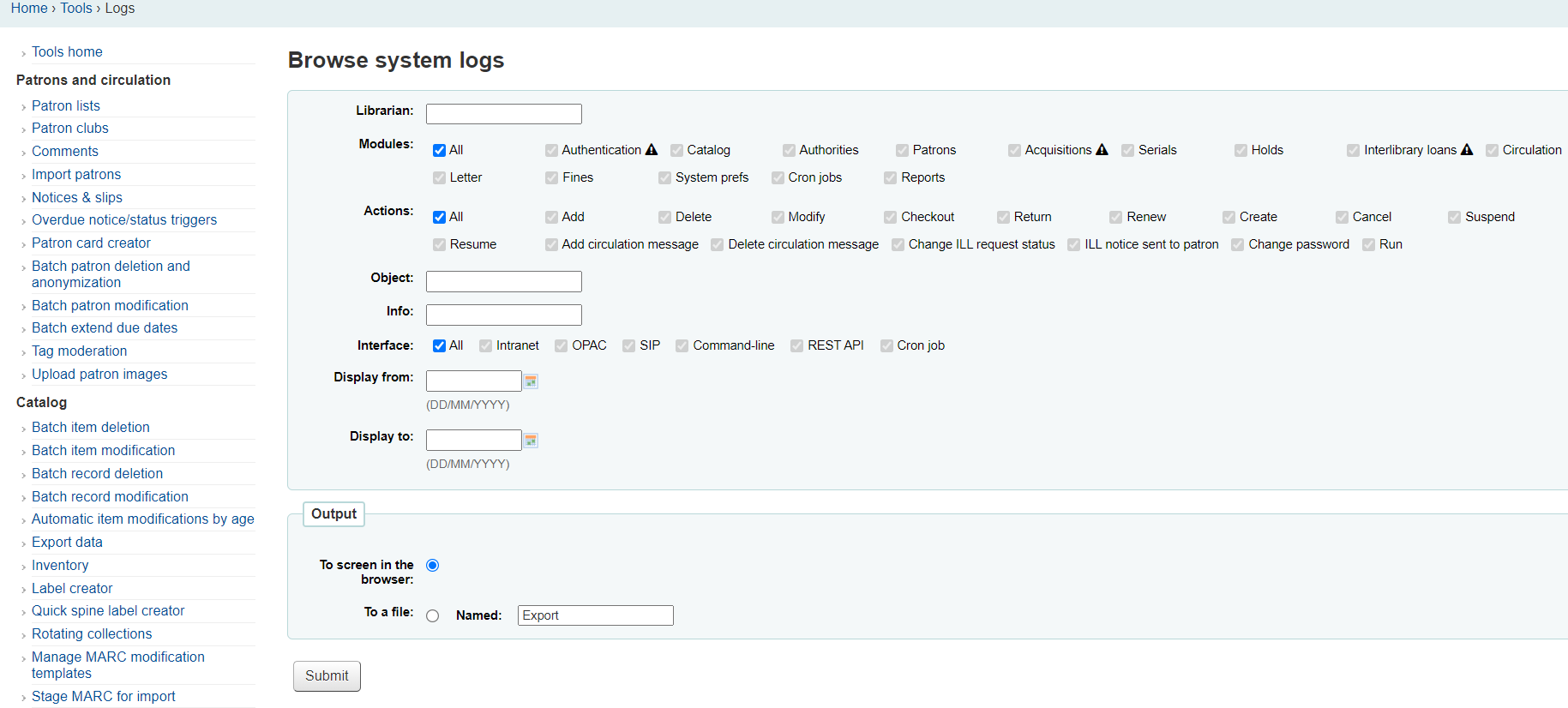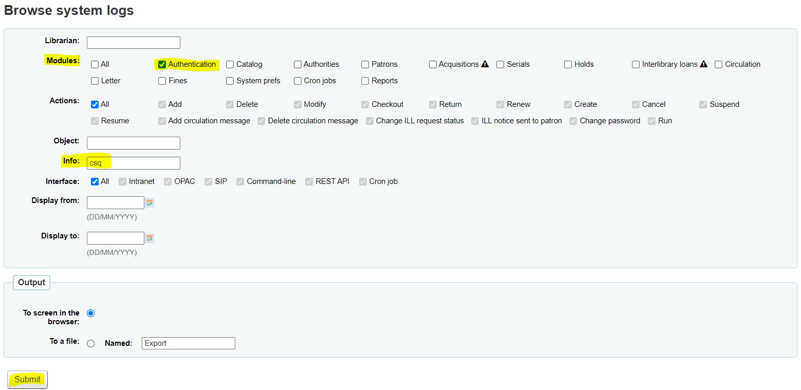 For example, in the Modules section, untick the All option and tick the Authentication option. This is where the login information is drawn from, so this must be selected regardless of how the results are being reduced by other parameters.