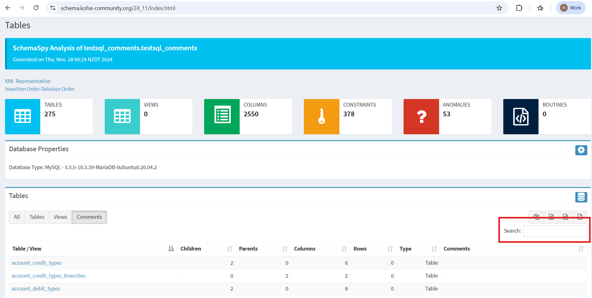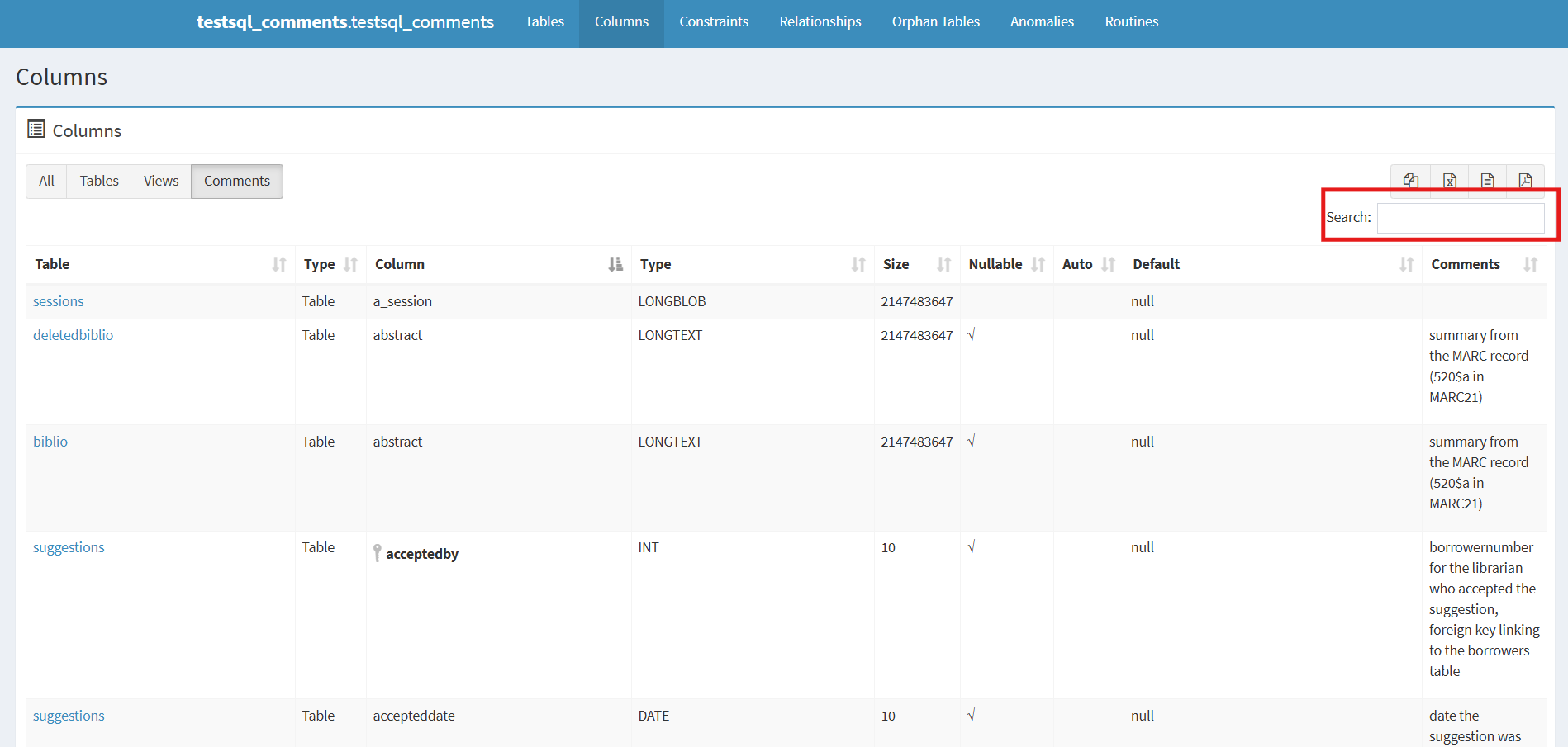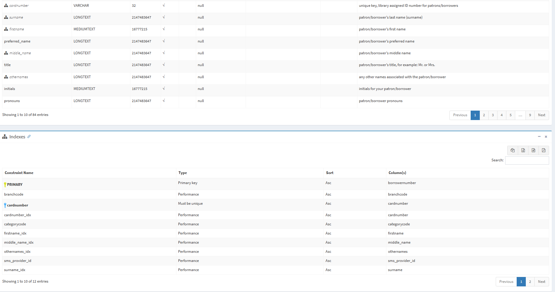 The table containing the names of the tables in the Koha database is sorted alphabetically by table name by default. To find a specific table, use the Search box above the table containing the names of the tables in the Koha database.