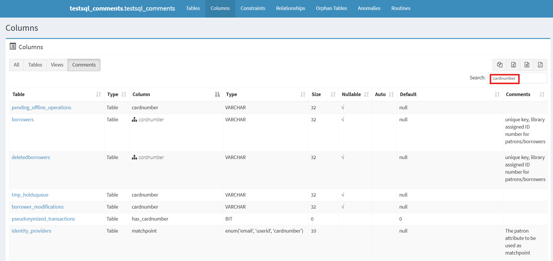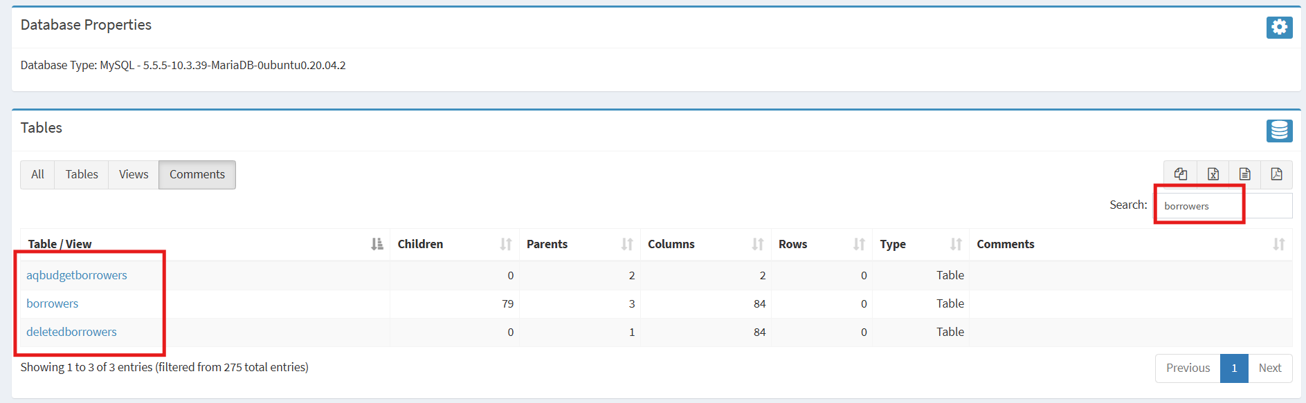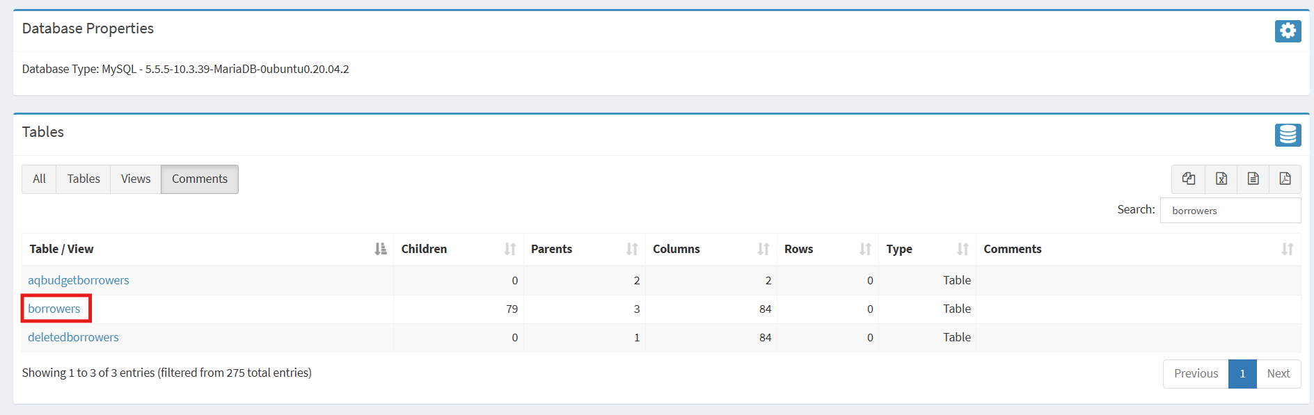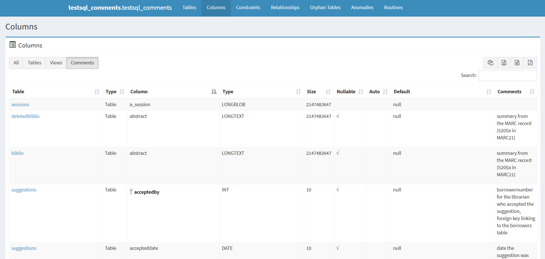 The table containing the names of the tables in the Koha database is sorted alphabetically by table name by default. To find a specific table, use the Search box above the table containing the names of the tables in the Koha database.
