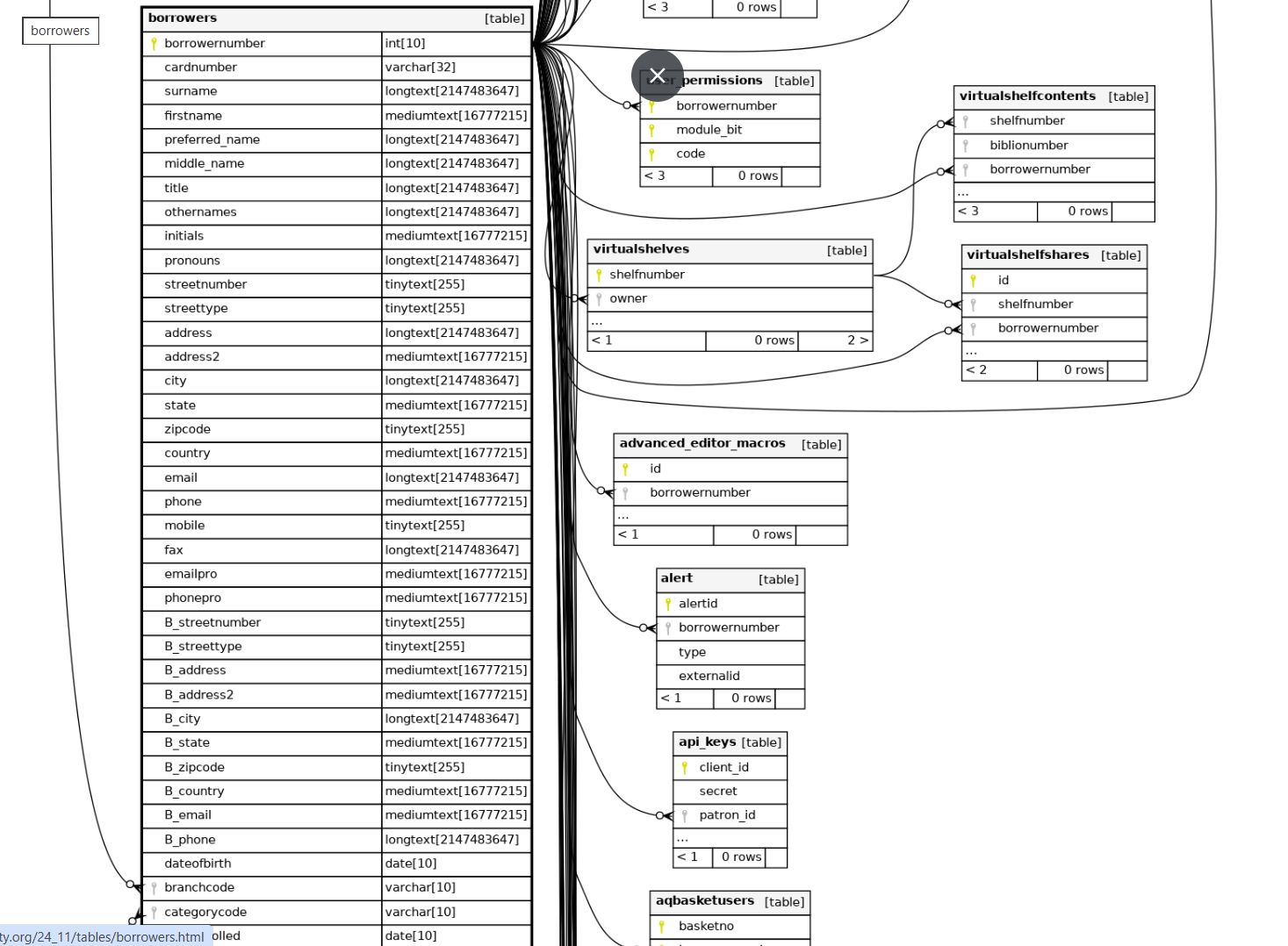Go to Reports > Other > Koha database schema.