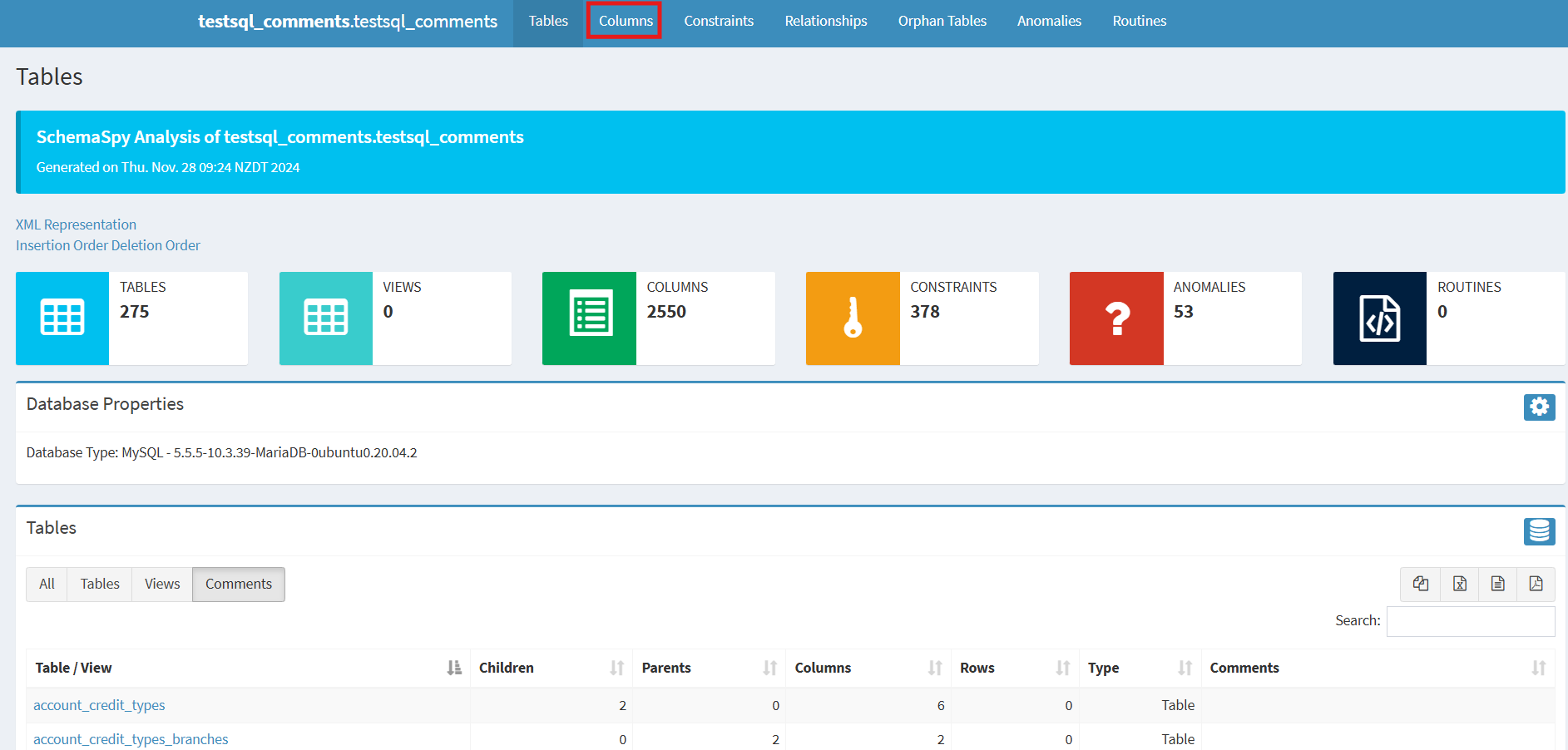 This will open a page in a new tab. This page will contain an overview of the tables that make up the database schema.