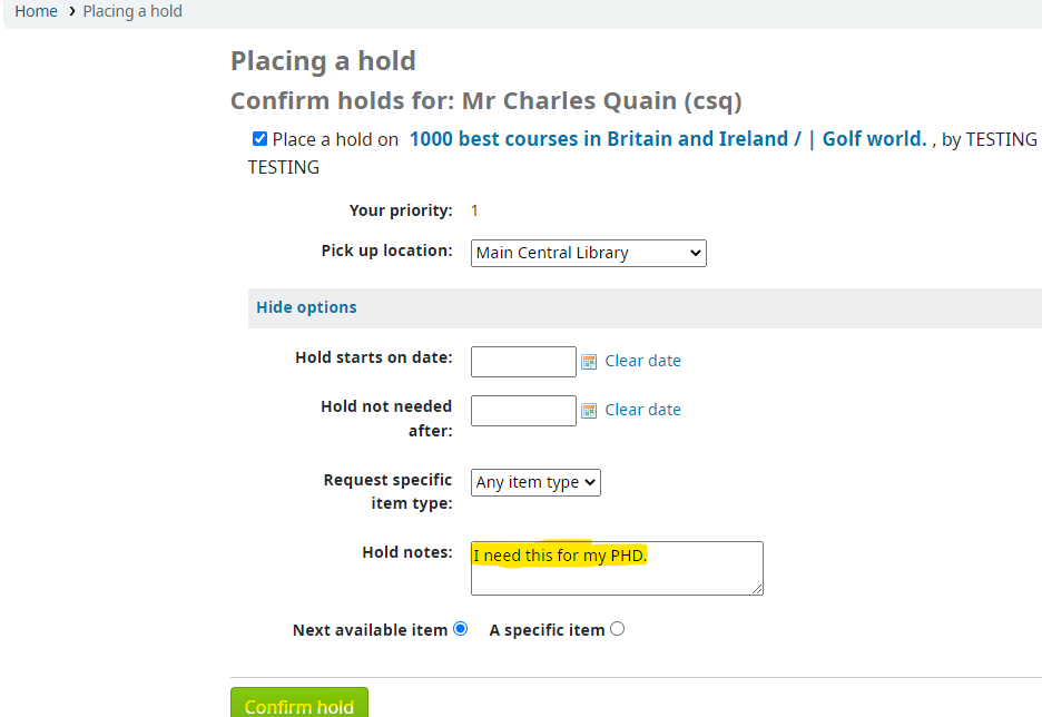 A note can be added to this box before clicking the Confirm hold button to complete placing the hold.
