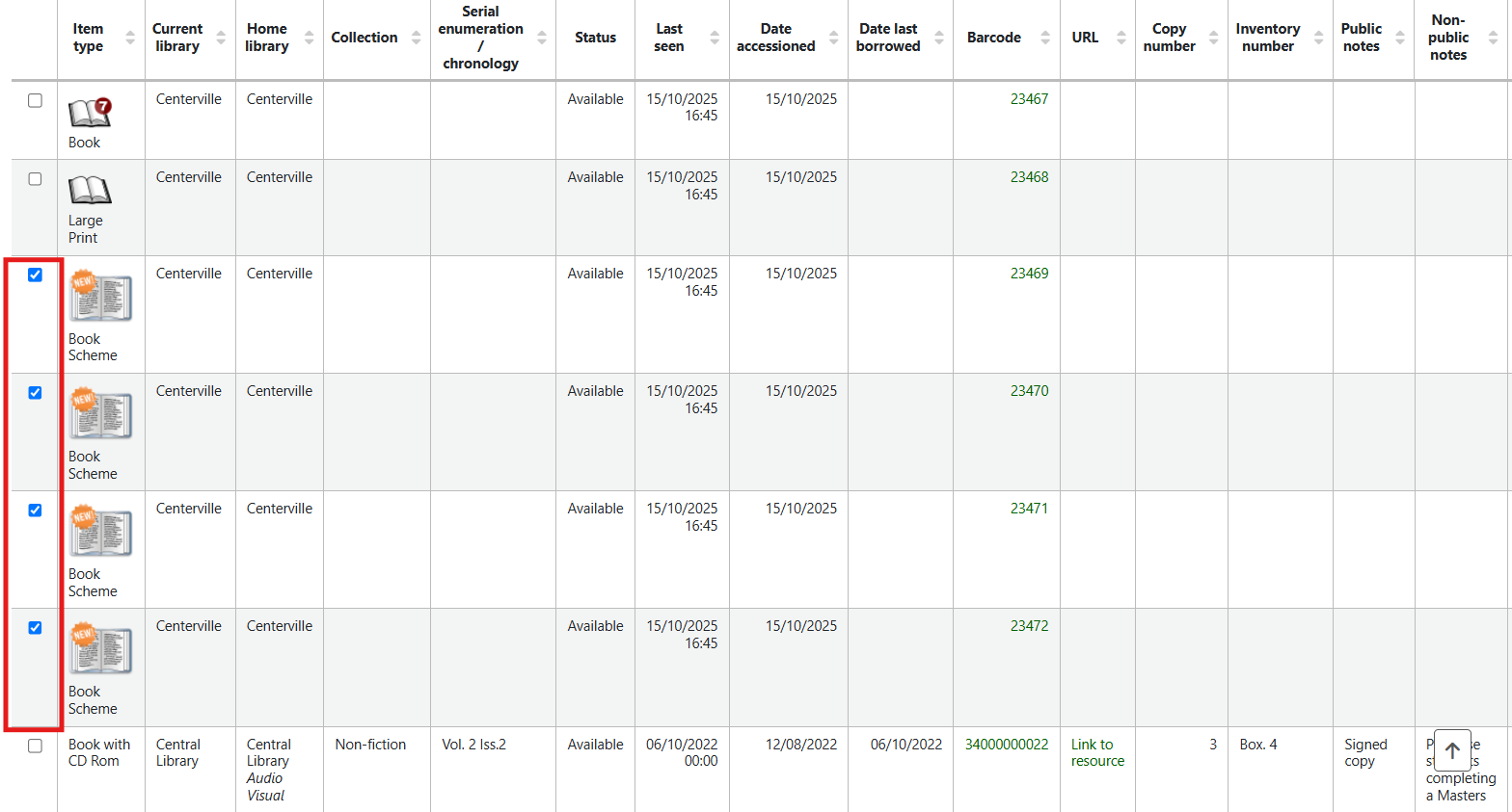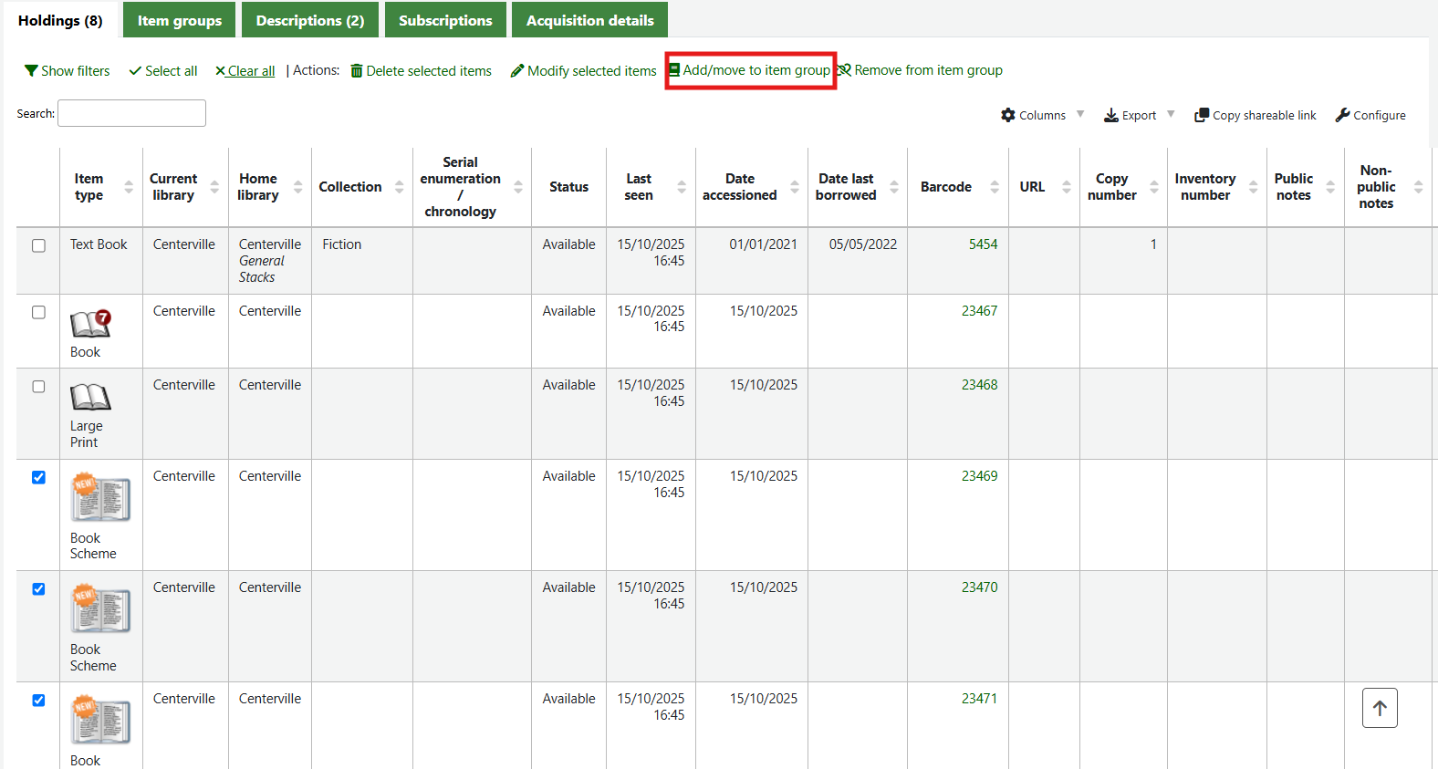 Once the item group has been defined, click the little box to the left hand side of the holdings table on the line of the item to be added to the group.