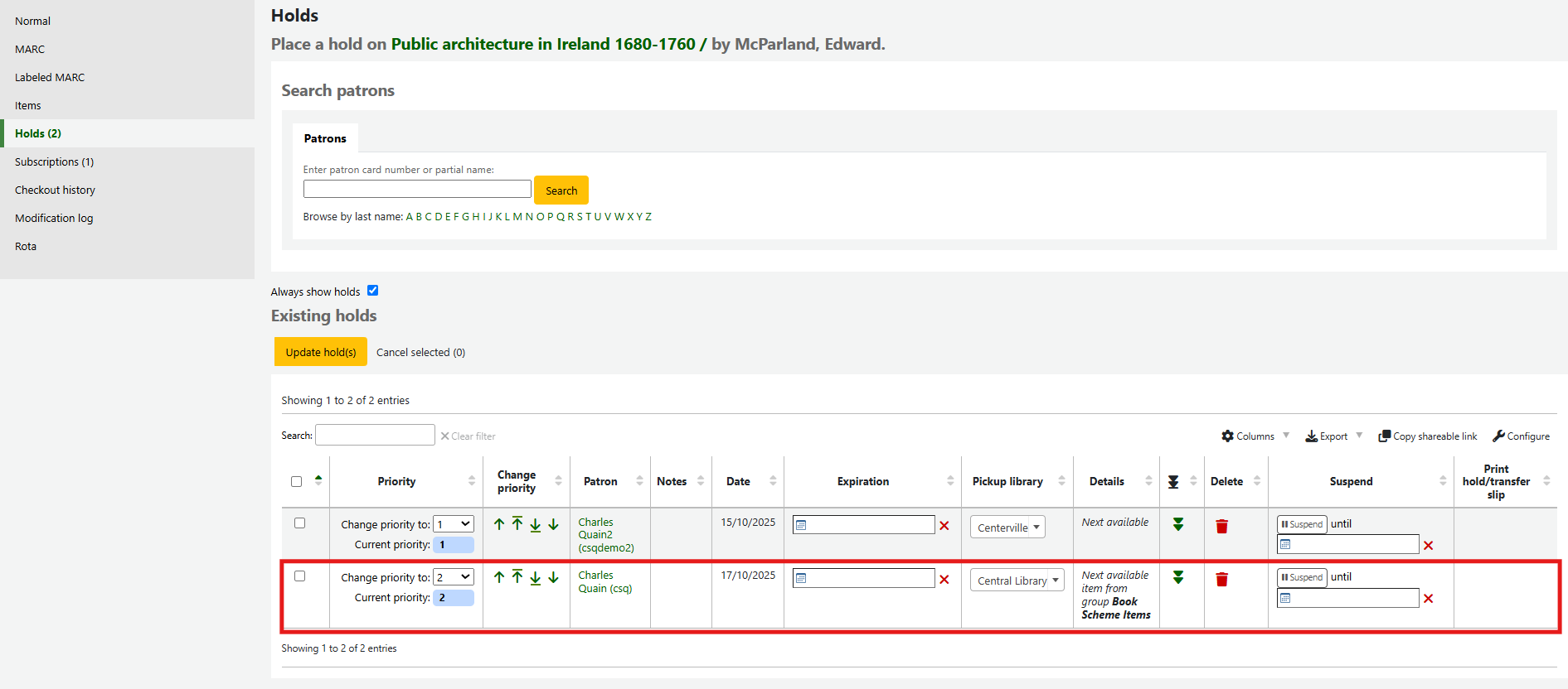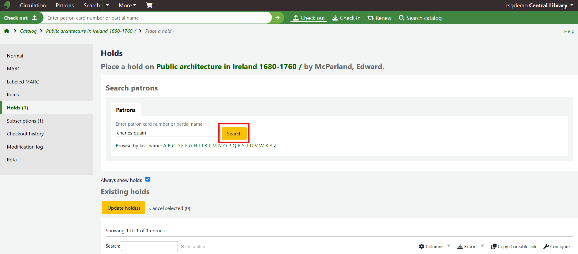 Search for the patron to place the hold for.