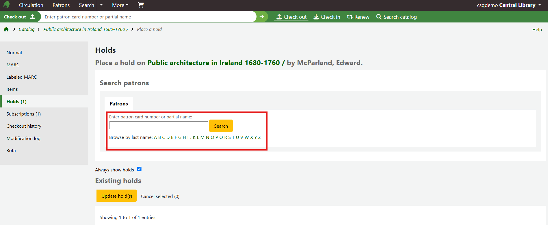 This will take you to a new page where the patron to place the hold for can be found.