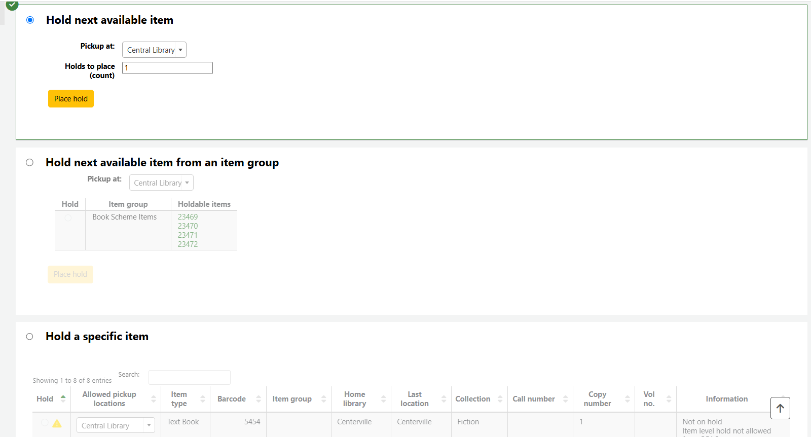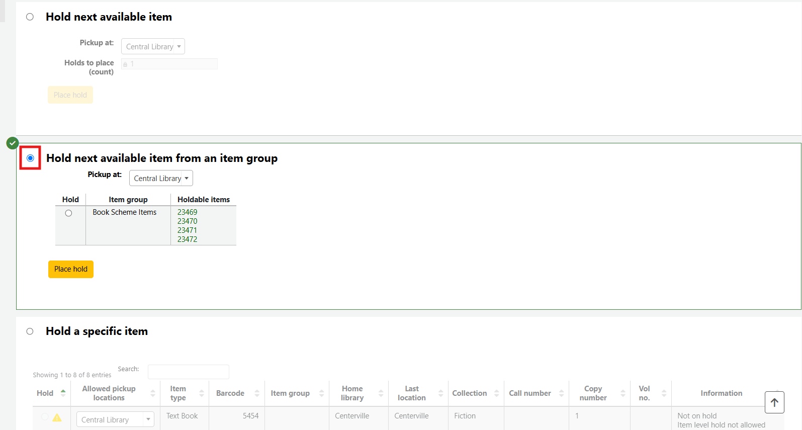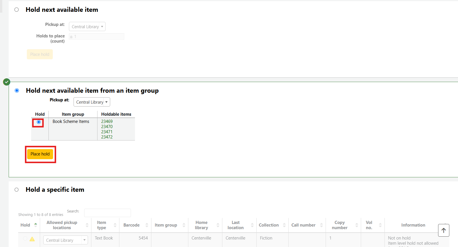 Click the radial button beside the item group the hold should be filled from and click Place hold.