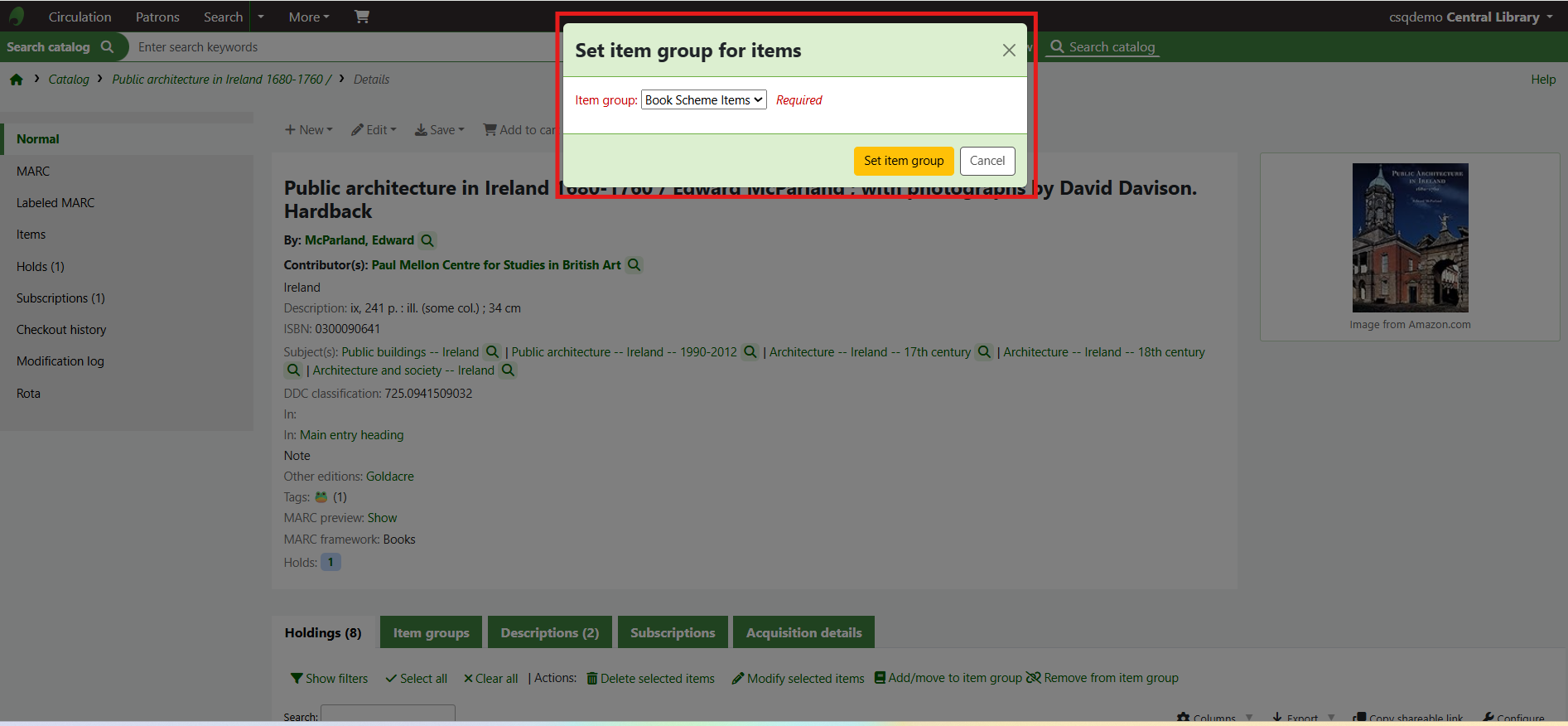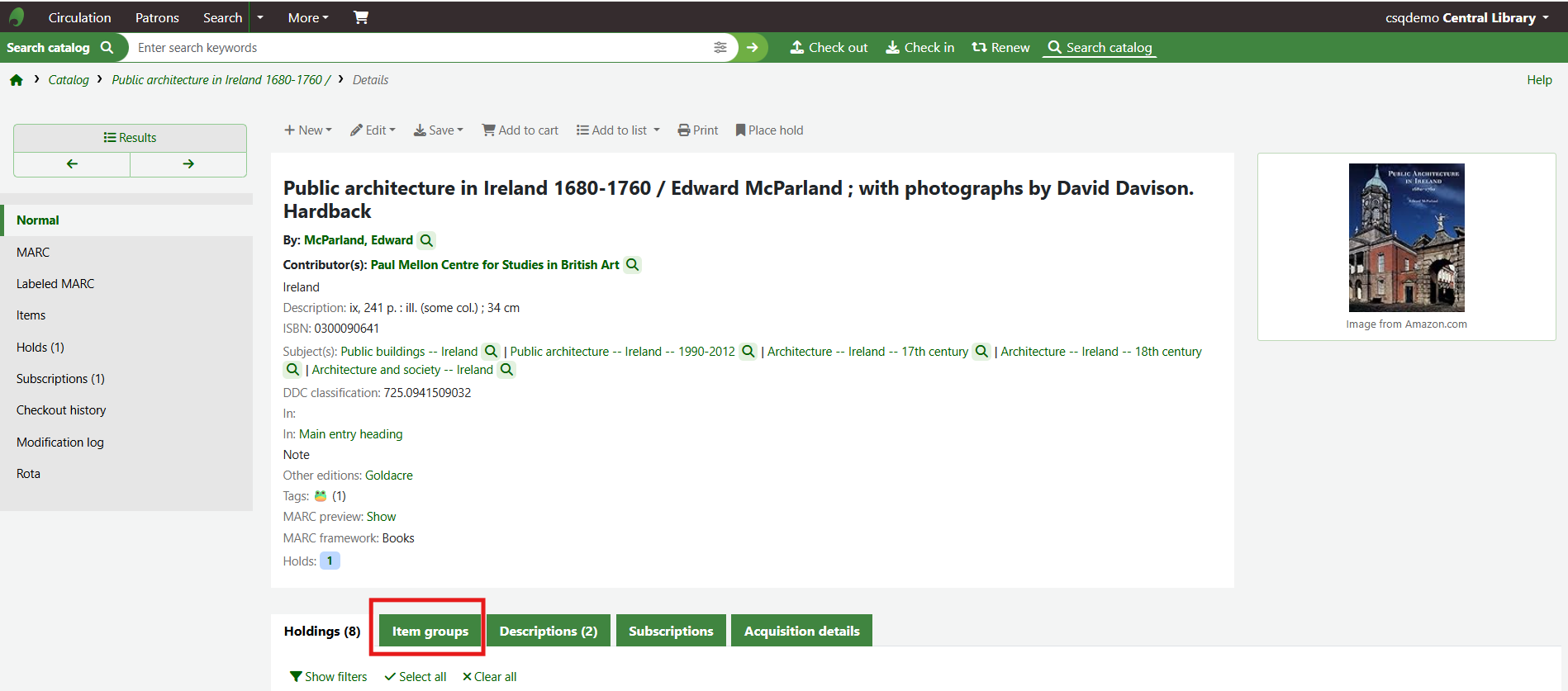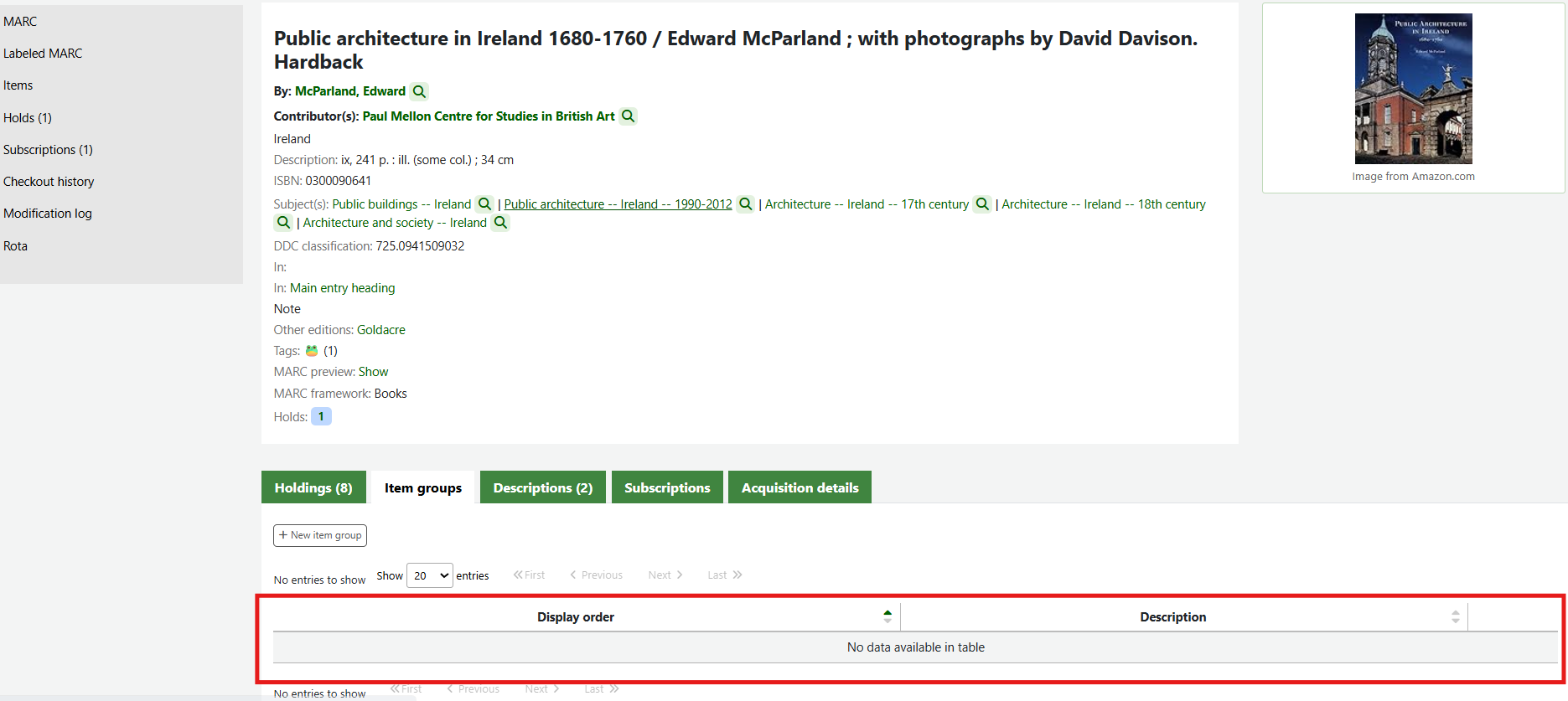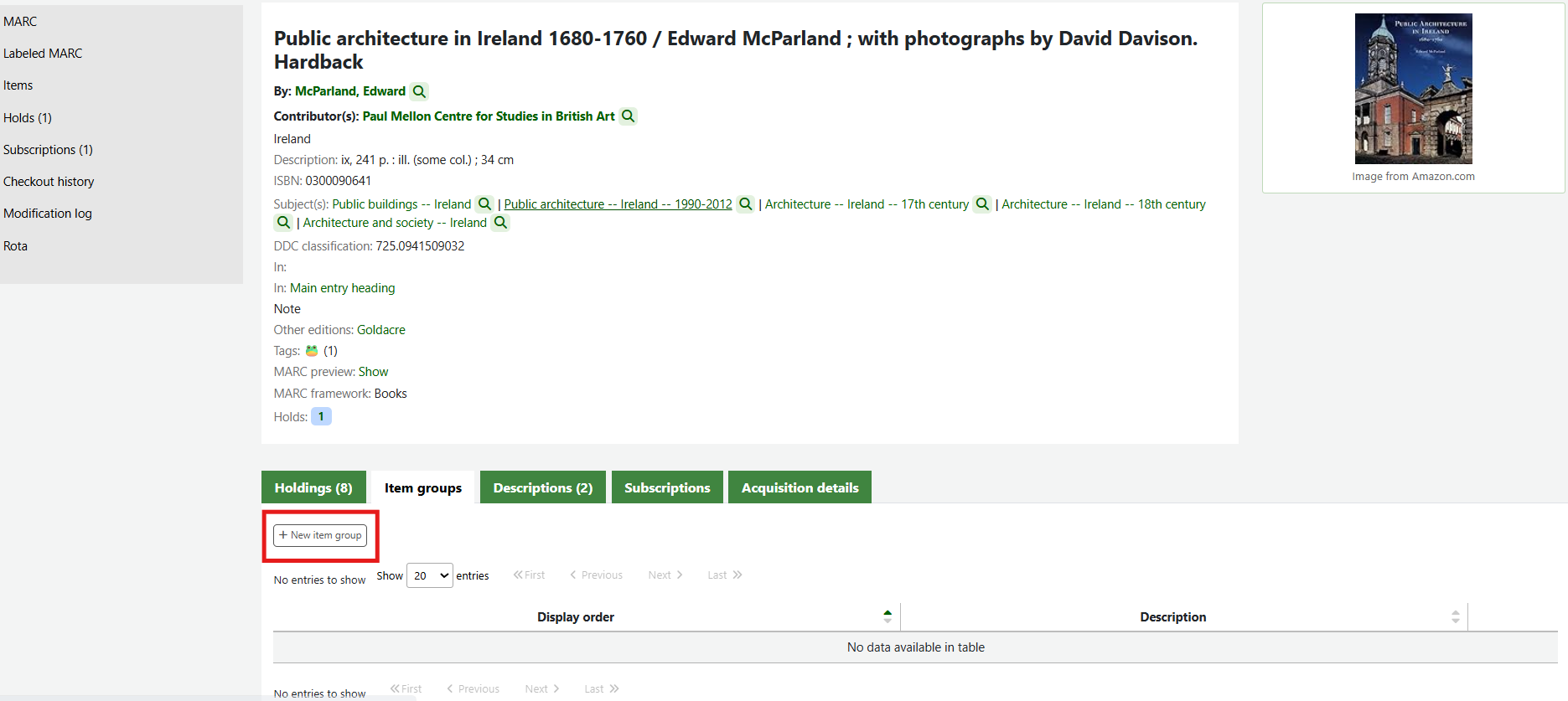 If the item group system preferences have been successfully enabled there will be a tab for Item groups at the top of the holdings table.