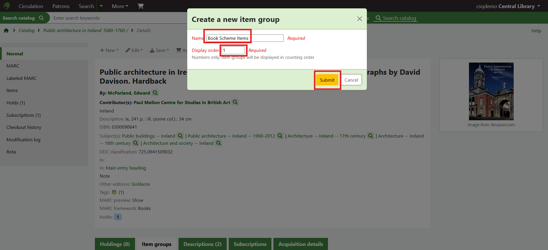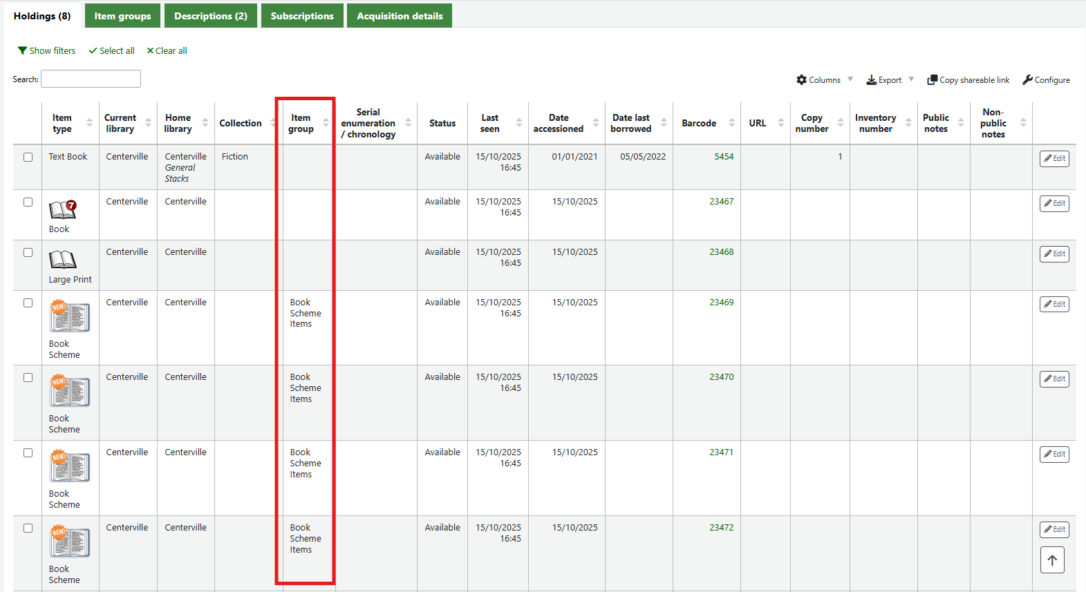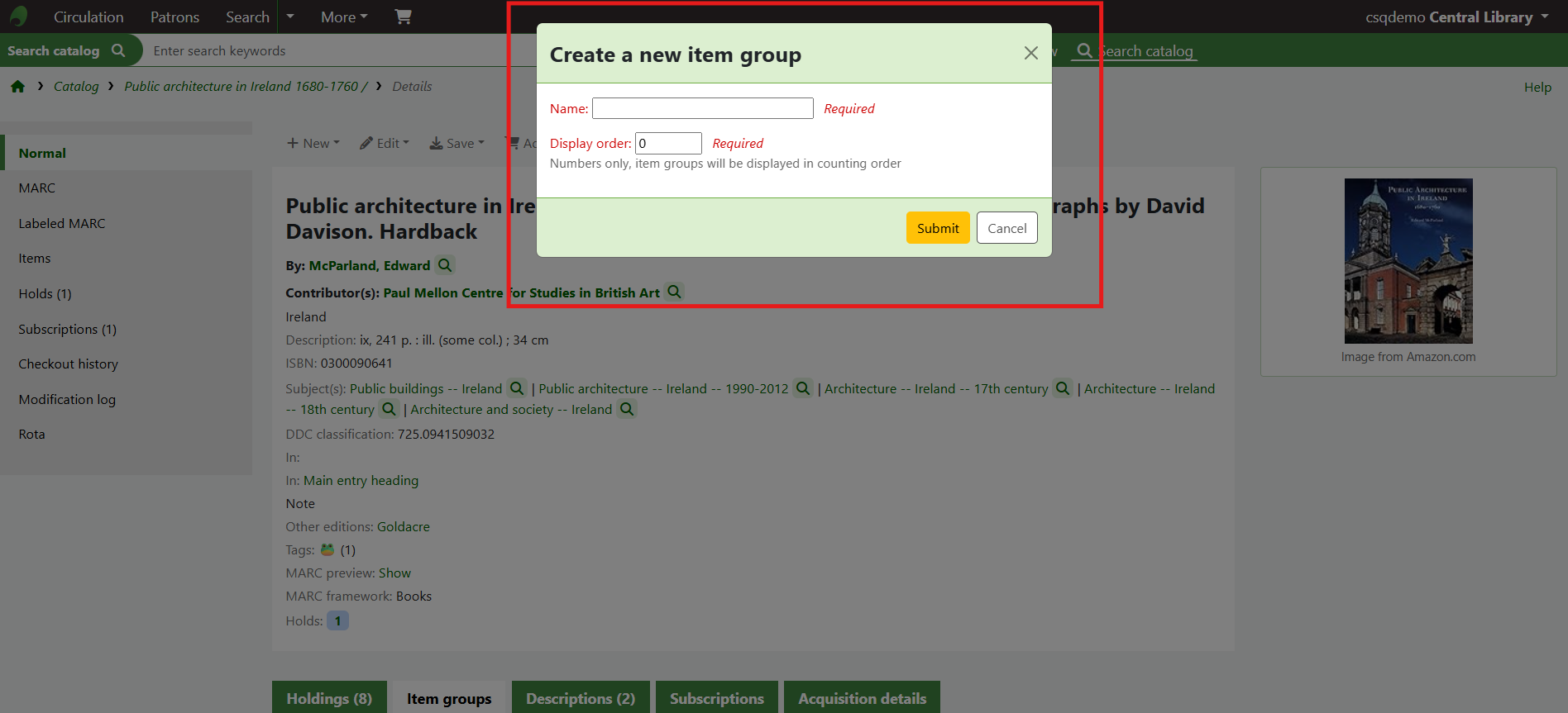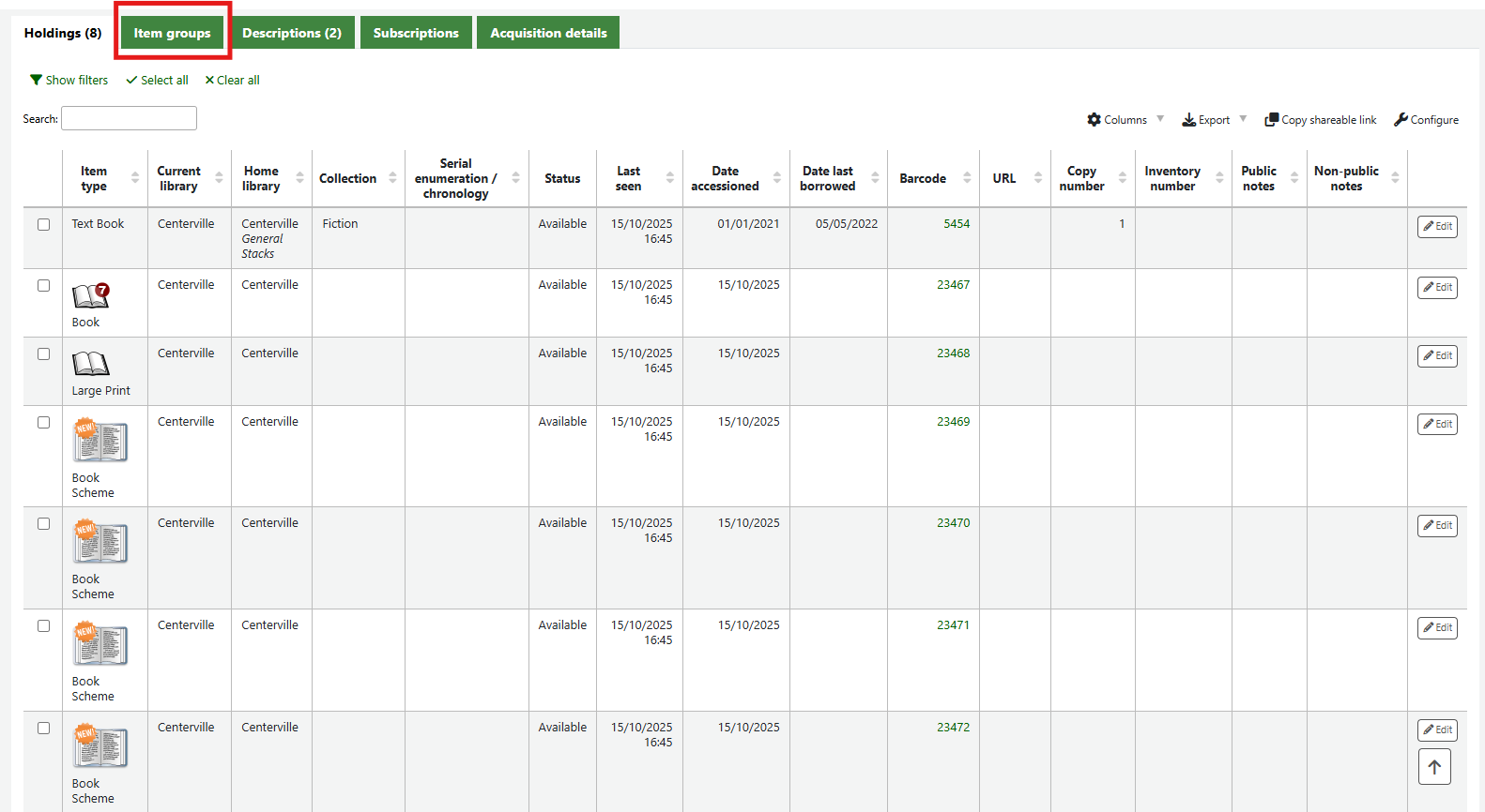 If the item group system preferences have been successfully enabled there will be a tab for Item groups at the top of the holdings table.