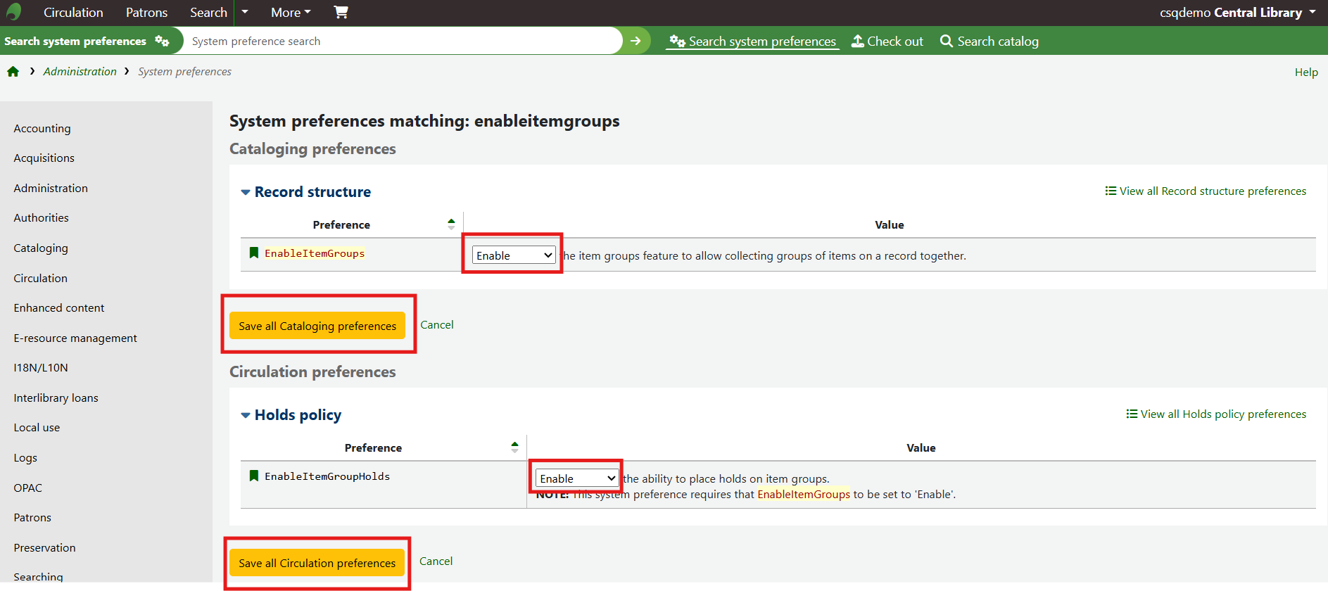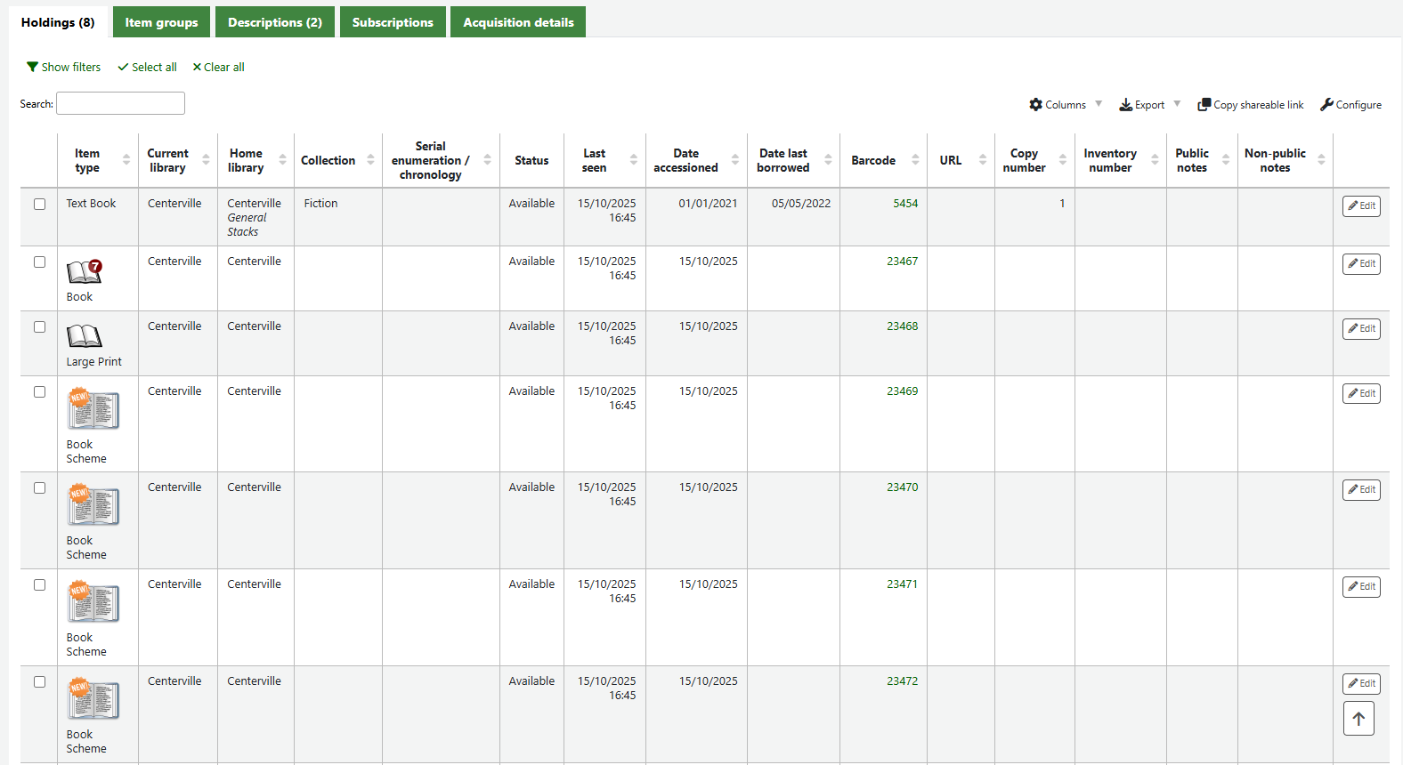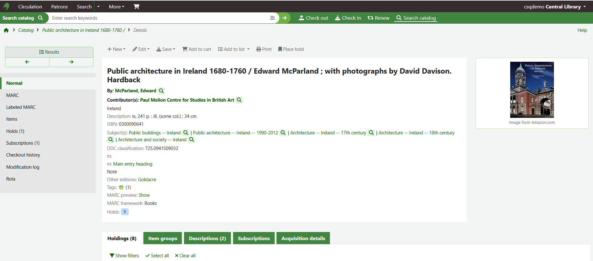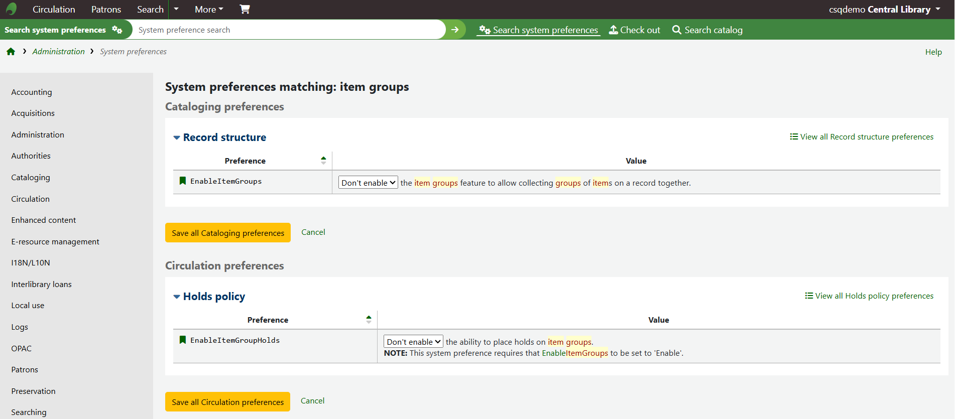 If the item group system preferences have been successfully enabled there will be a tab for Item groups at the top of the holdings table.