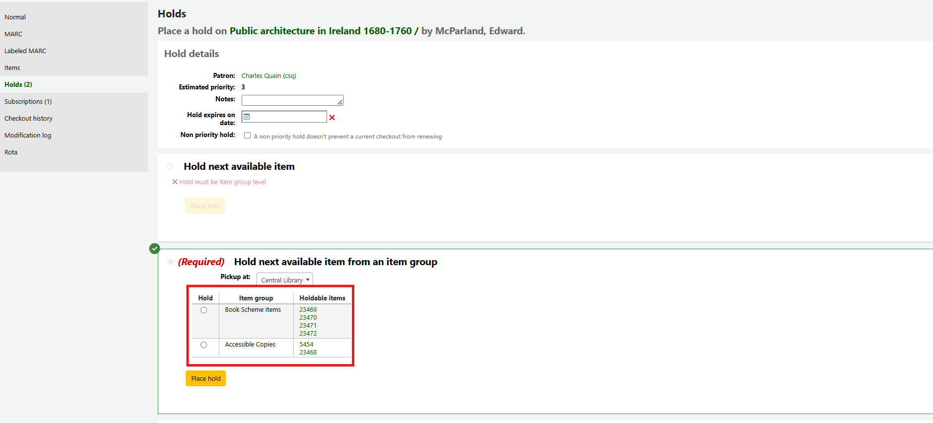 Item groups when placing holds