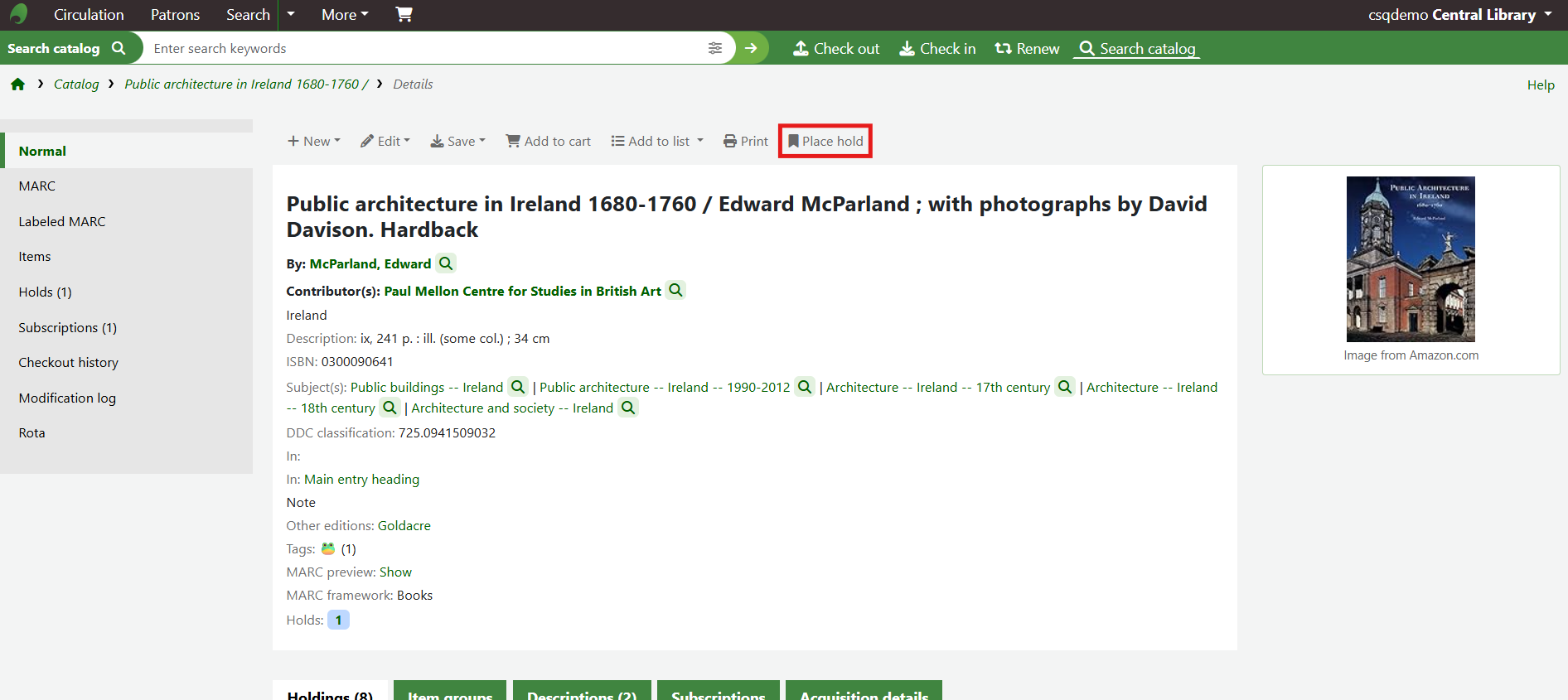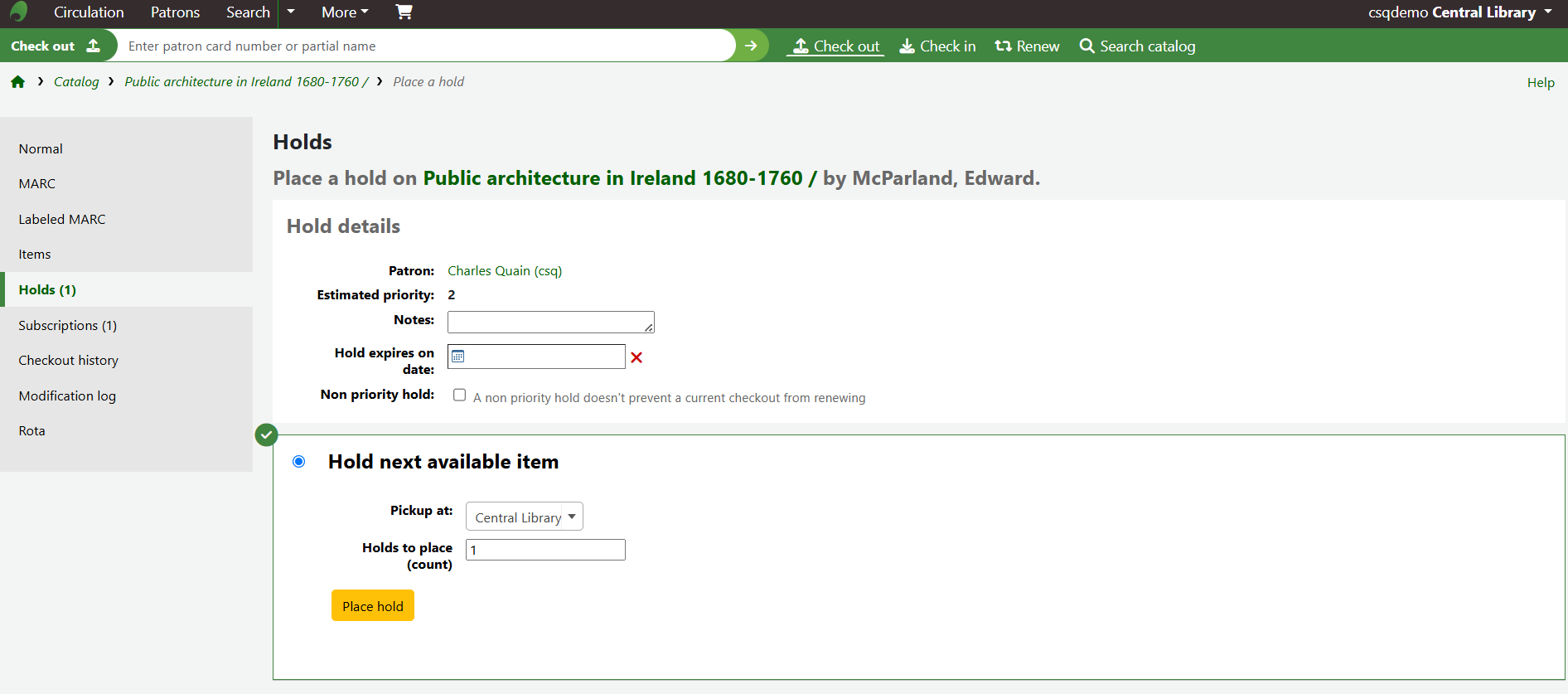 Click the Place hold at the top of the record.
