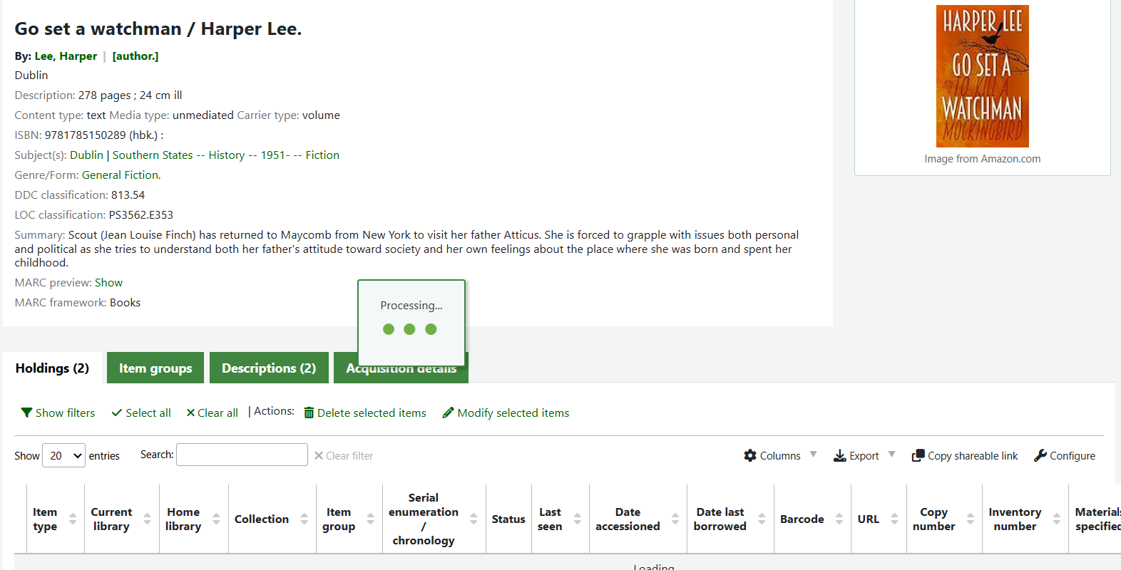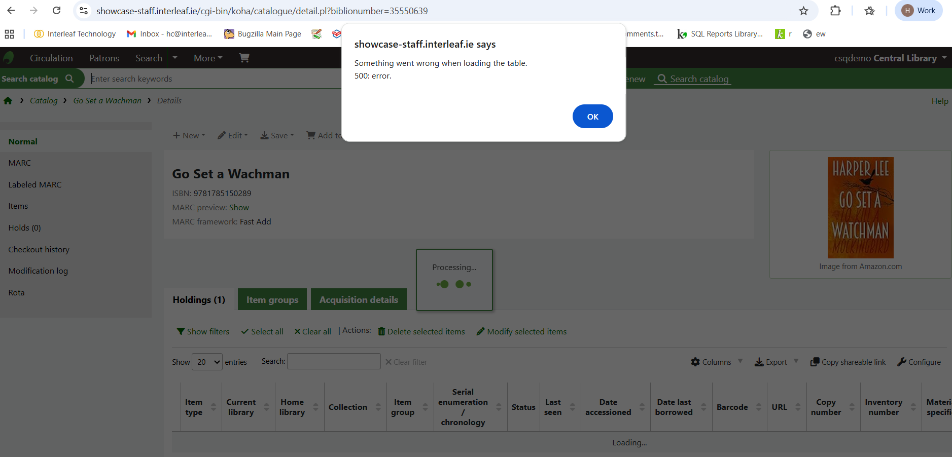 In this example, a staff member had completed a search for a title and the results were not displaying in full due to the error. After clicking the Ok button in the error popup, the staff member was taken to the record, but the items table was still stuck loading.