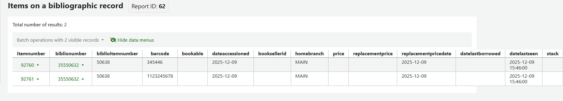 This report looks at all the content in the items table but it uses the WHERE function to limit the report to a specific bibliographic record. This prevents the report from bringing back all information from all items on the system and potentially slowing the system.