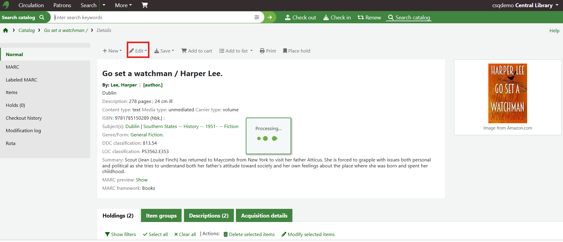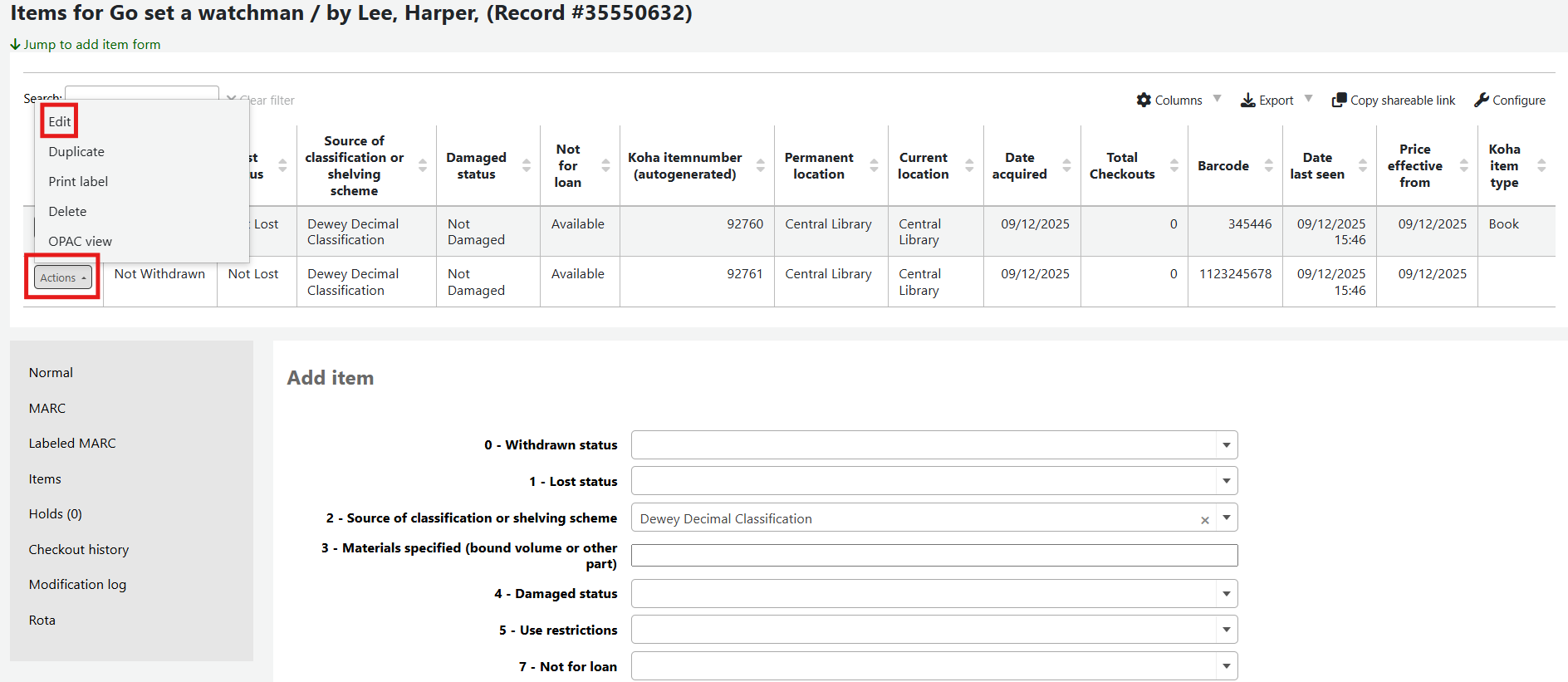 Go to the item records at the top of the page and click the Actions button on the first one. This will create a dropdown menu. Select Edit from the menu.