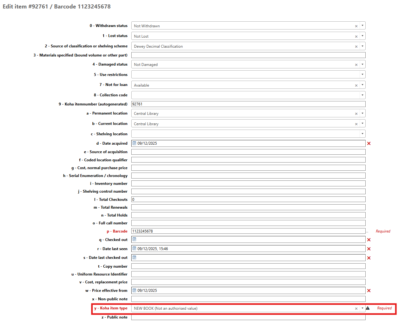 The y - Koha item type field is showing content but it includes a message that the item type is Not an authorised value, an authorised value being a defined entry for a dropdown list on Koha. This means that the item record has an entry that is not part of the standard options for item types on this system.