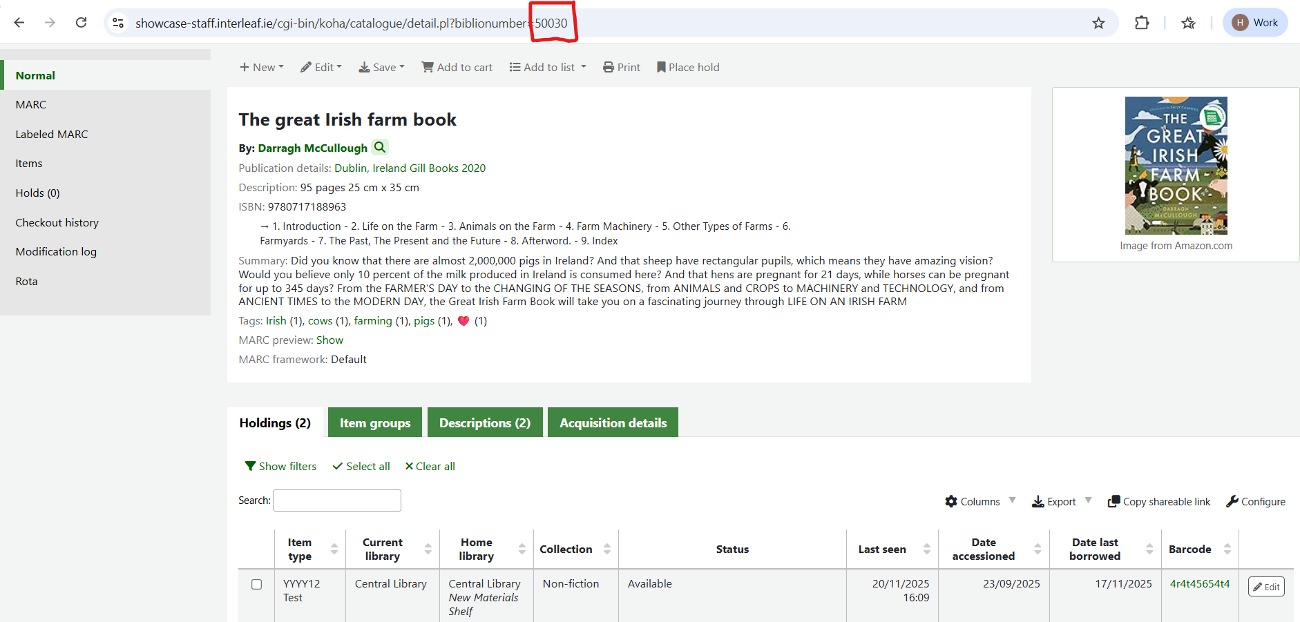 Biblionumbers are unique numbers automatically applied by Koha to bibliographic records created on the site. These numbers are assigned as title records are created and cannot be edited from within the Koha application. The function of a biblionumber is to act as an identification number for a title record.