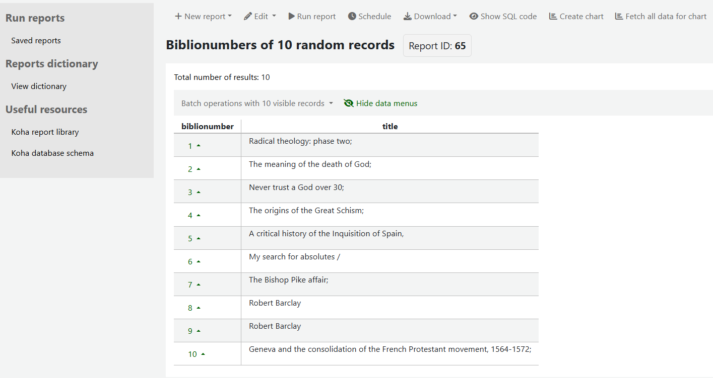 As all title records will have biblionumbers an unlimited report should not be run as the resources used to bring back the result might slow the site