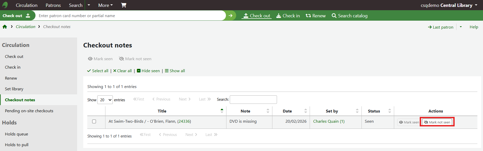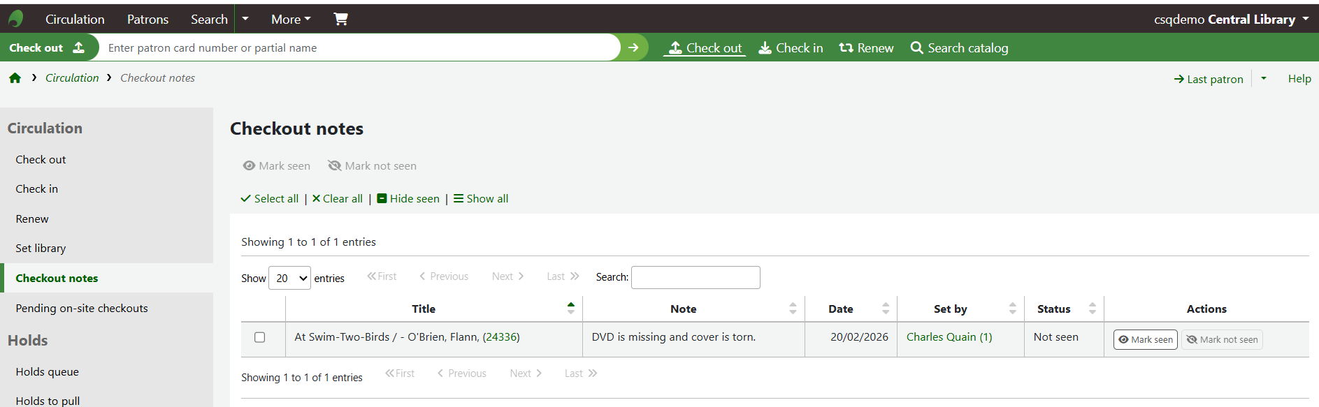 Staff can choose to mark checkout notes as Seen from the Checkout notes table.