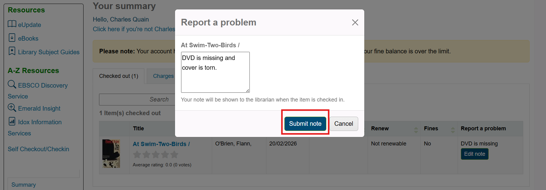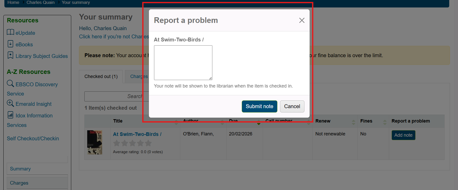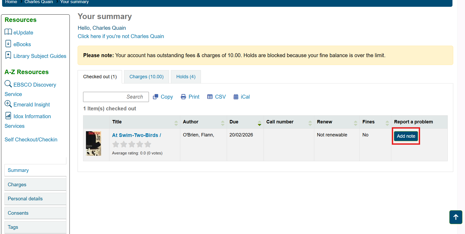 The far right column on the Checked out table will be called Report a problem. Click the Add note button in this column.
