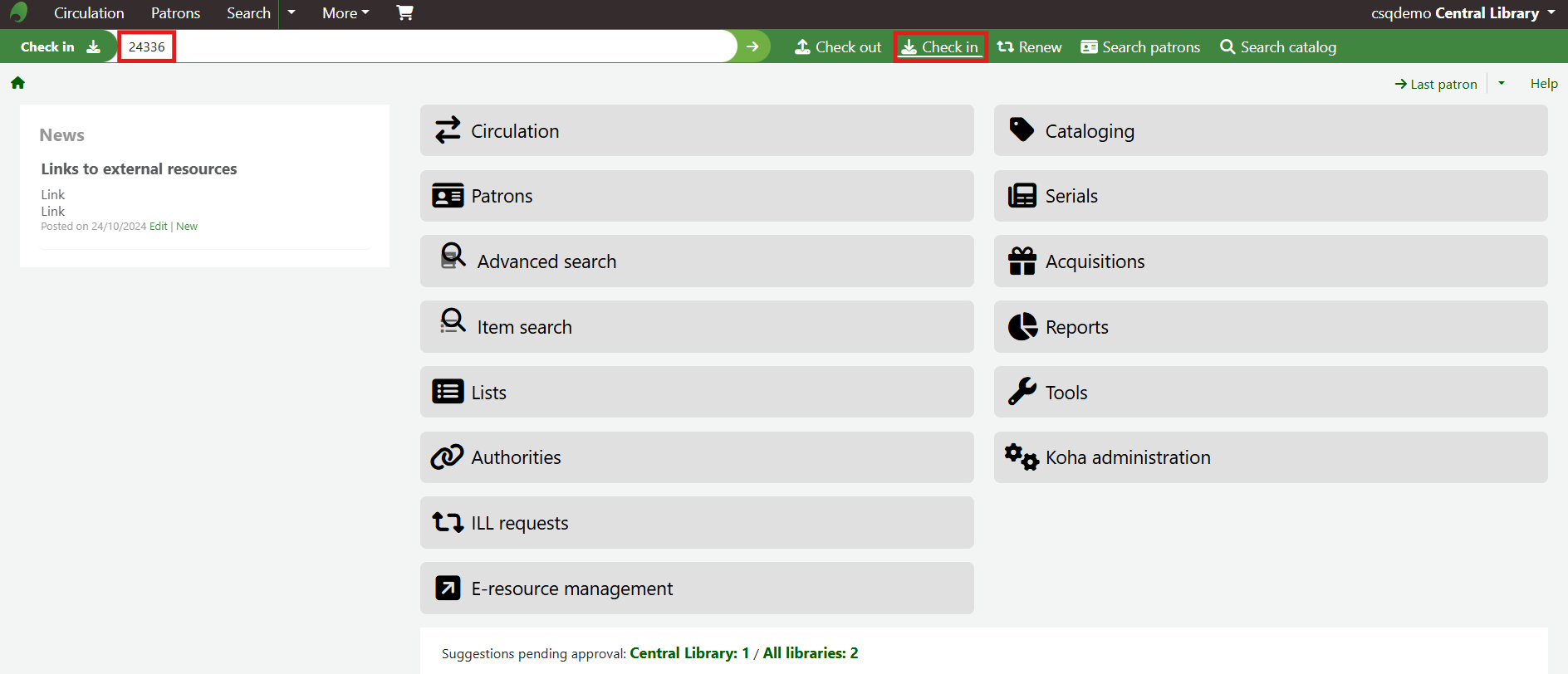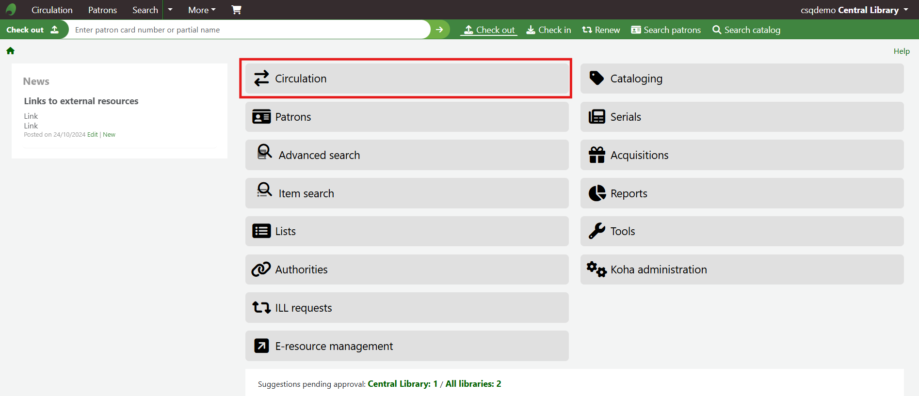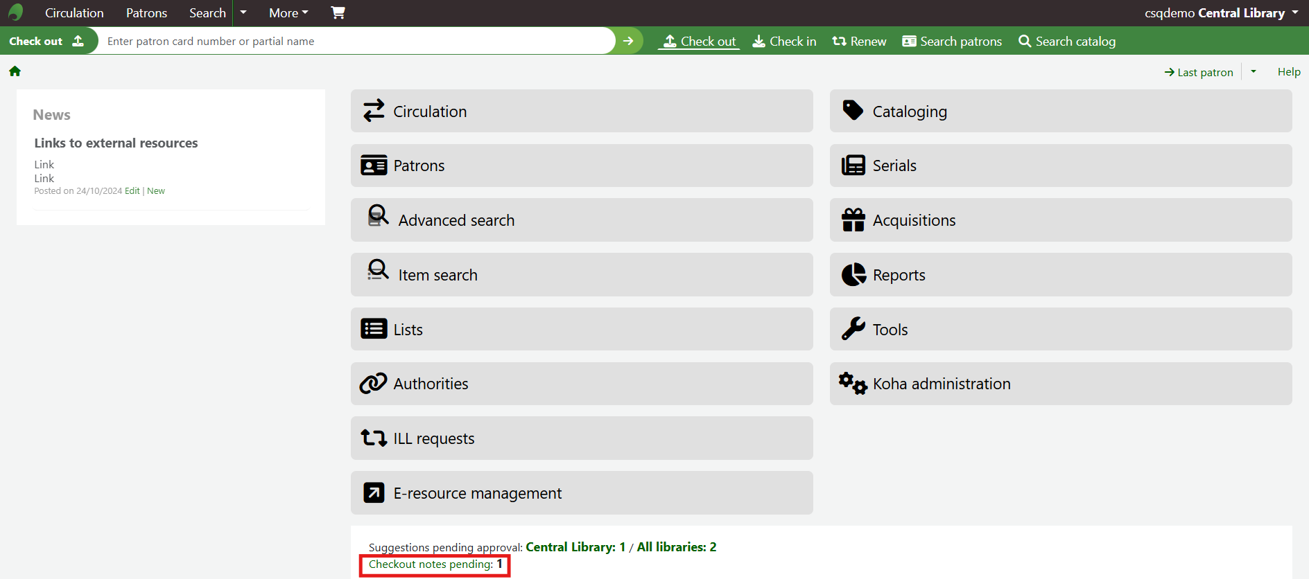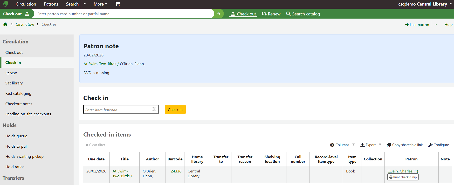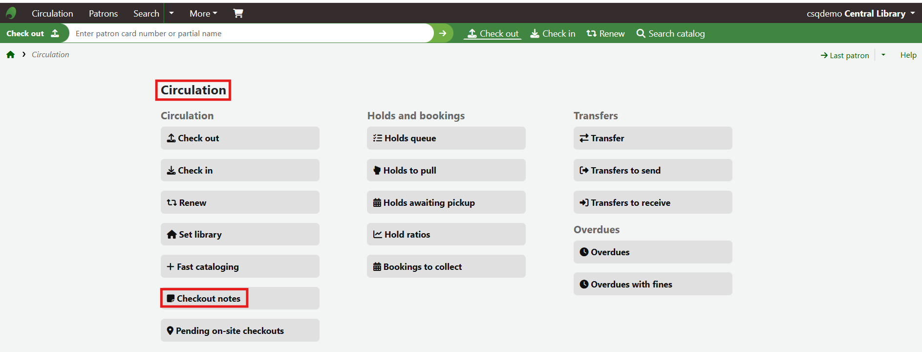 Alternatively, navigate to Circulation > Checkout Notes to see all Checkout notes on the site.