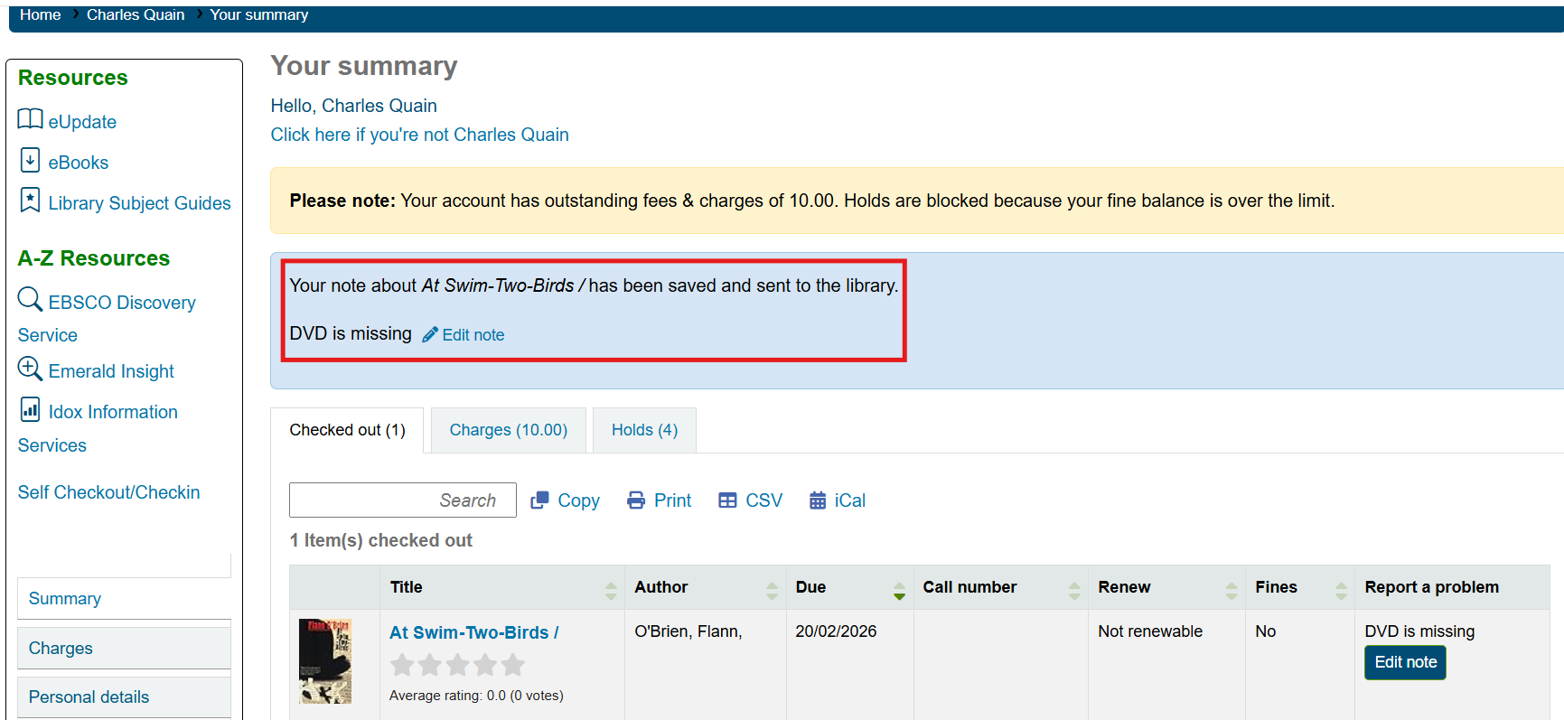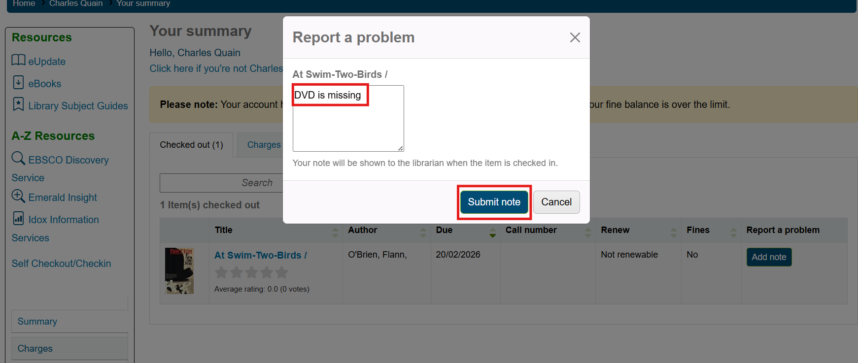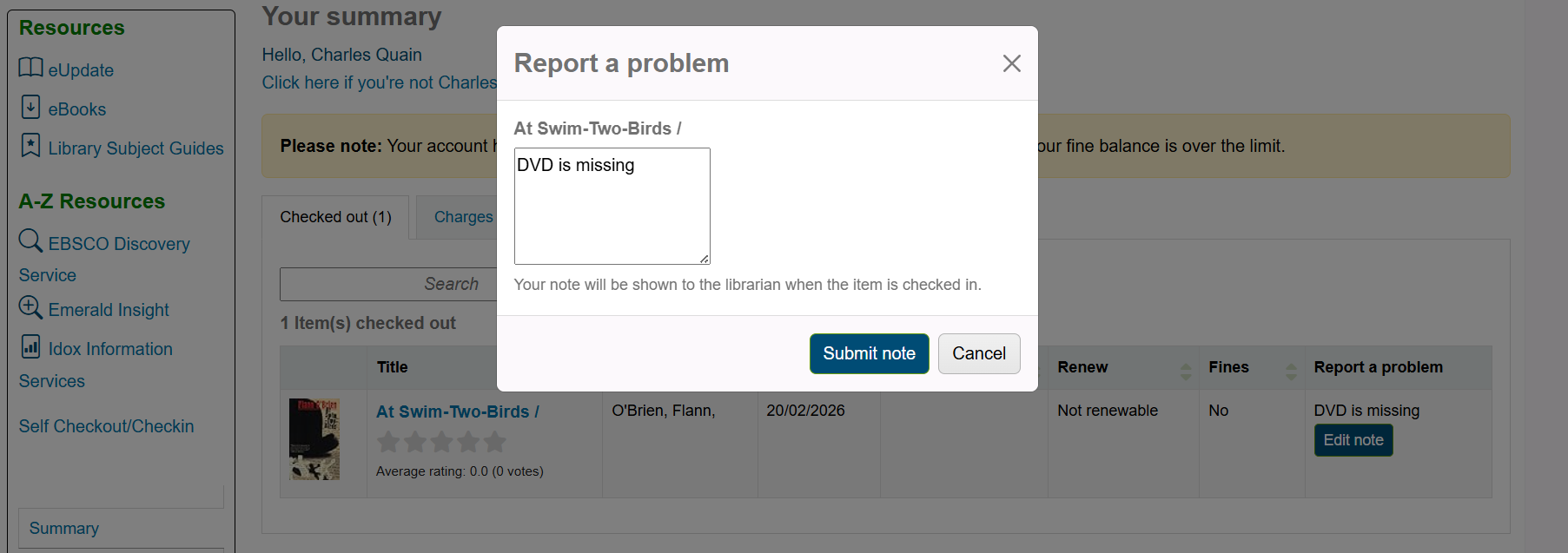 Adding a note to a checked out item on the OPAC