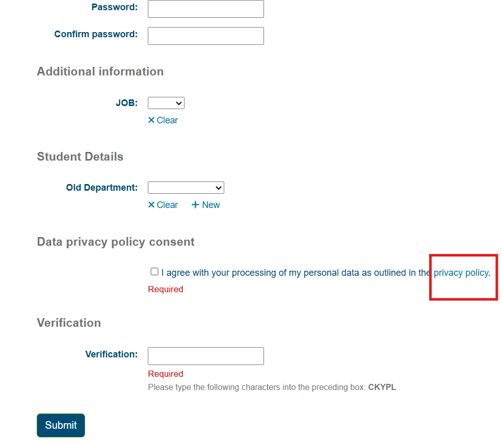 When this system preference is enabled a field requesting the user consent to a privacy policy will appear at the bottom of the OPAC self registration and on the user account on the OPAC.