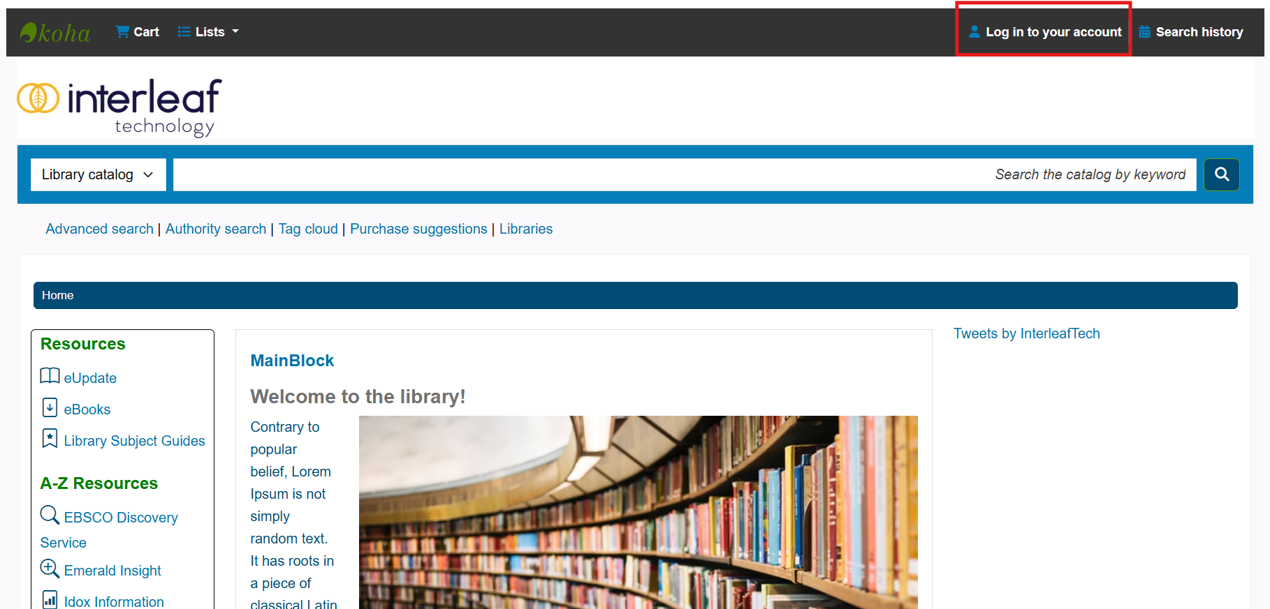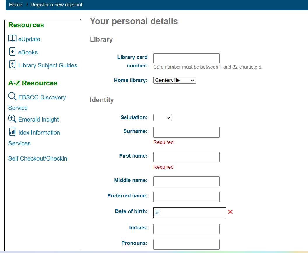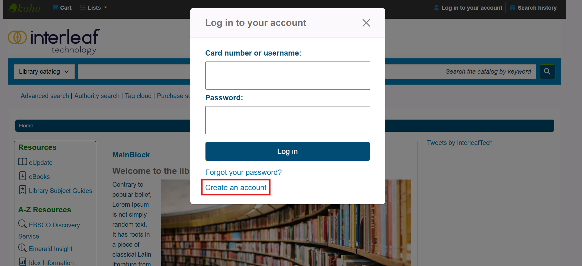 Navigate to the self registration form by clicking Log in to your account on the OPAC. This will bring up a popup box with login options and a link to Create an account.