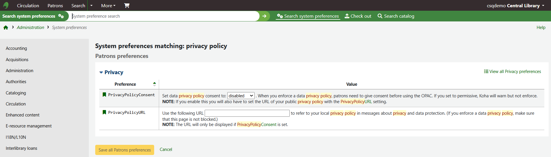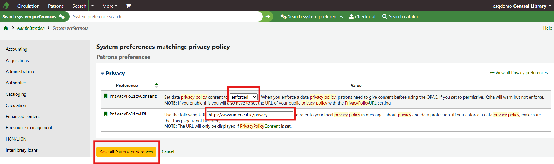 Once these system preferences have been enabled, when an existing patron logs into the OPAC they will automatically be brought to their own record and will be asked to consent to the privacy policy.