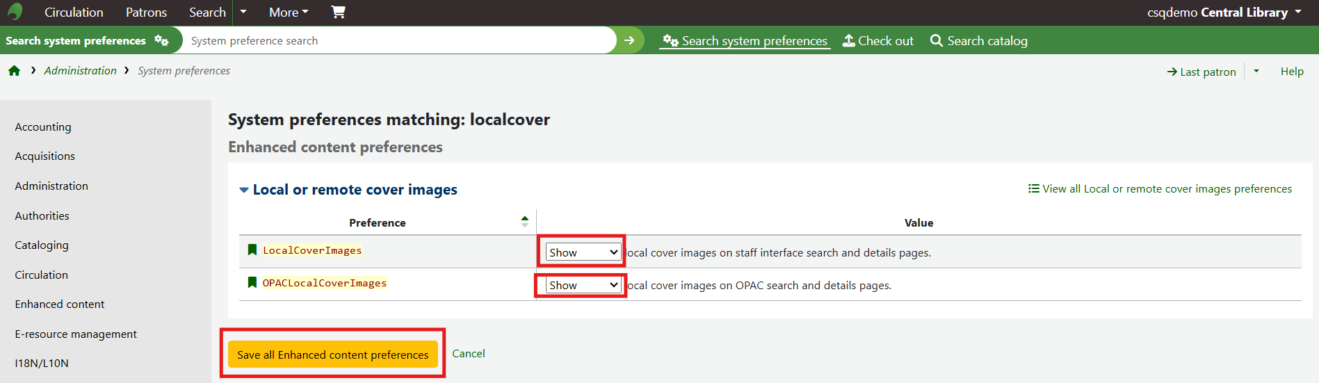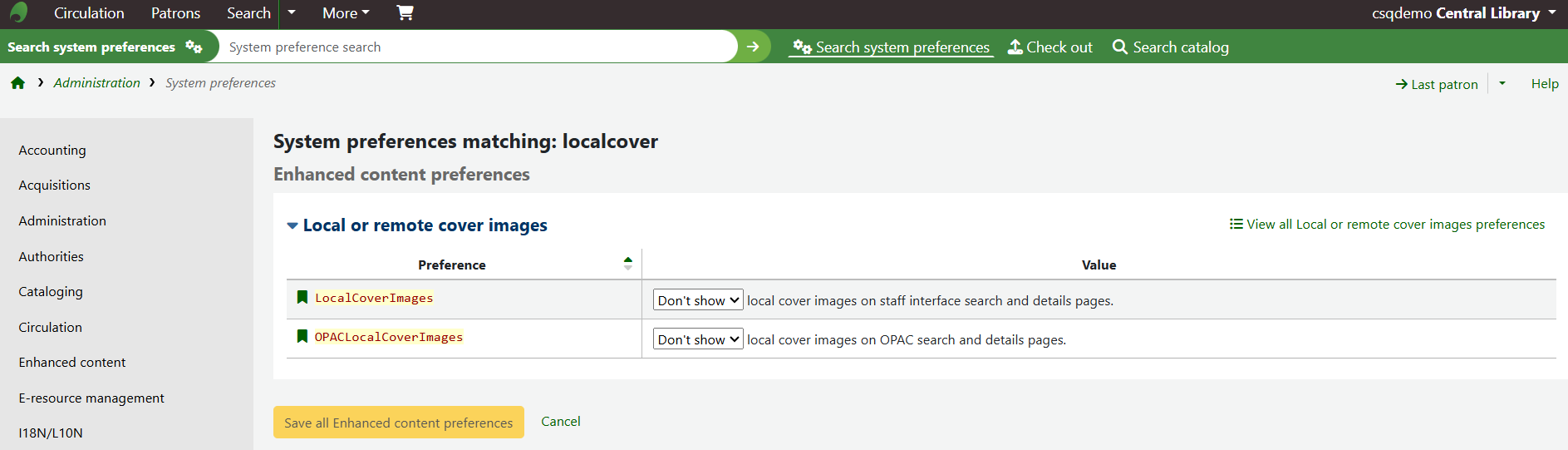 This will bring up two system preferences related to this feature, LocalCoverImages and OPACLocalCoverImages.