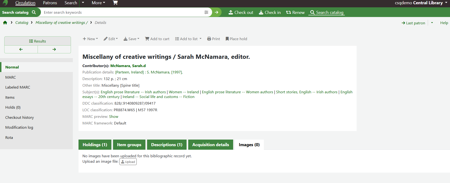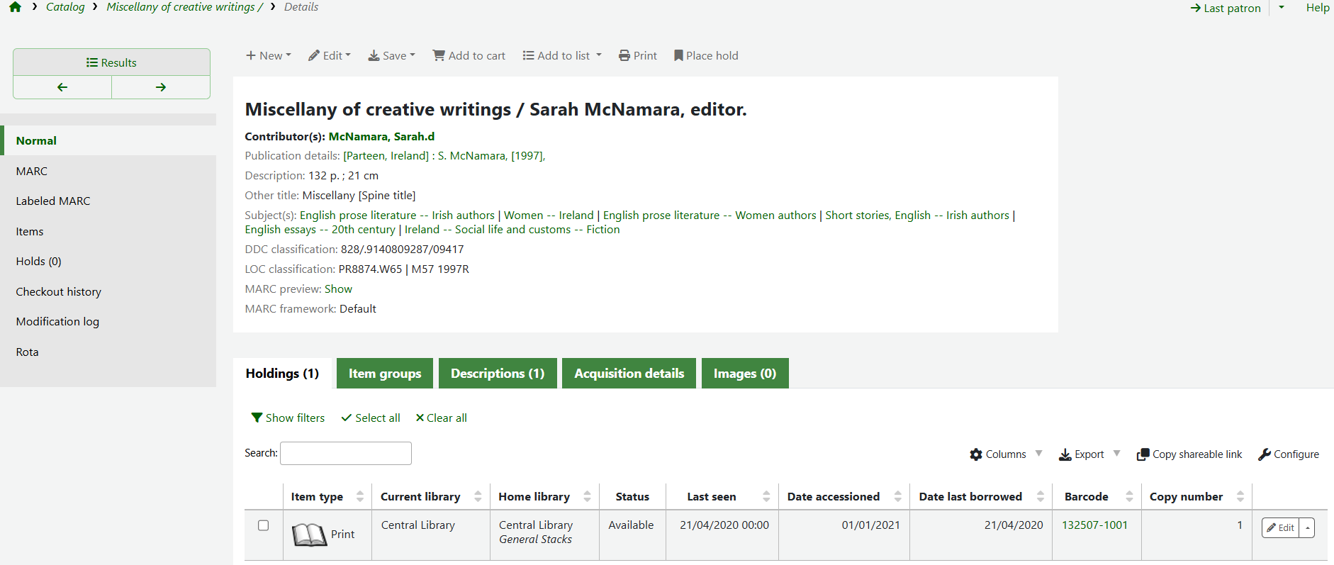 It is possible to add a new item to an already existing bibliographic record. Unlike when adding a catalogue record from scratch, which involves creating both a bibliographic record for title information and then associated item records for the ...