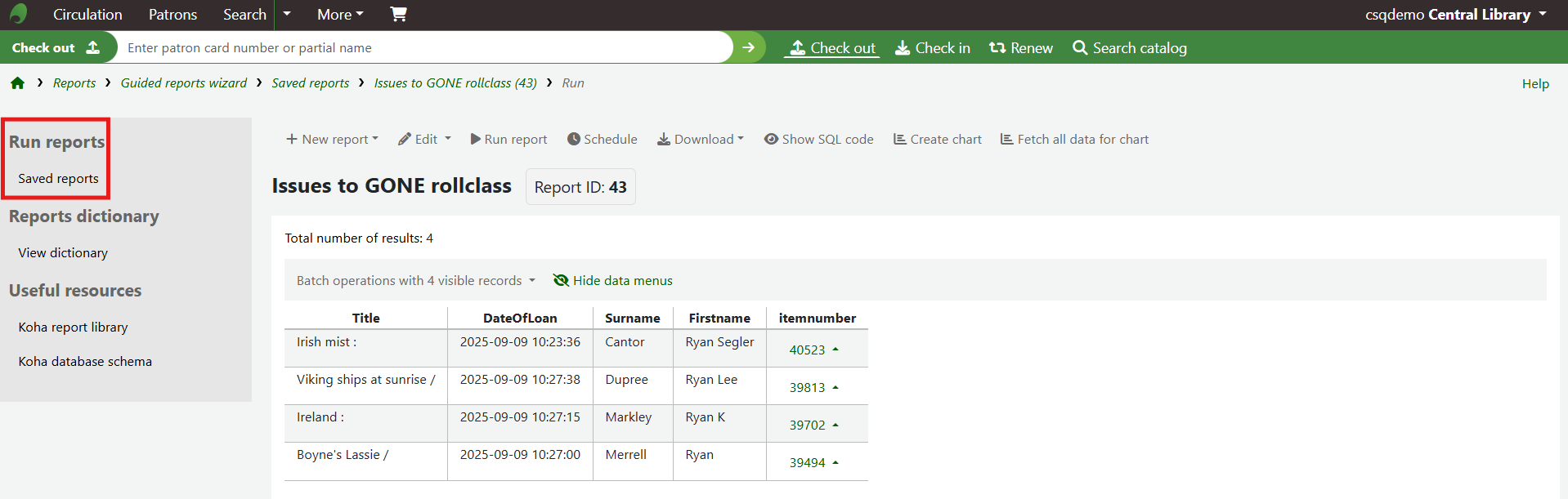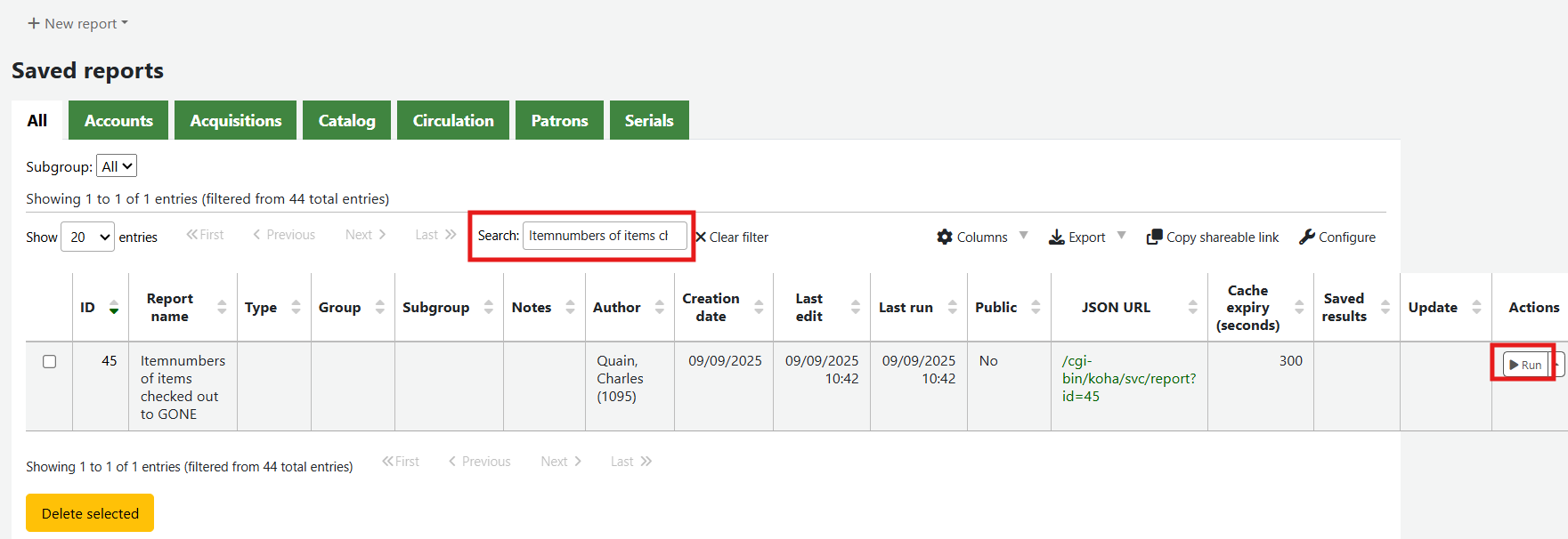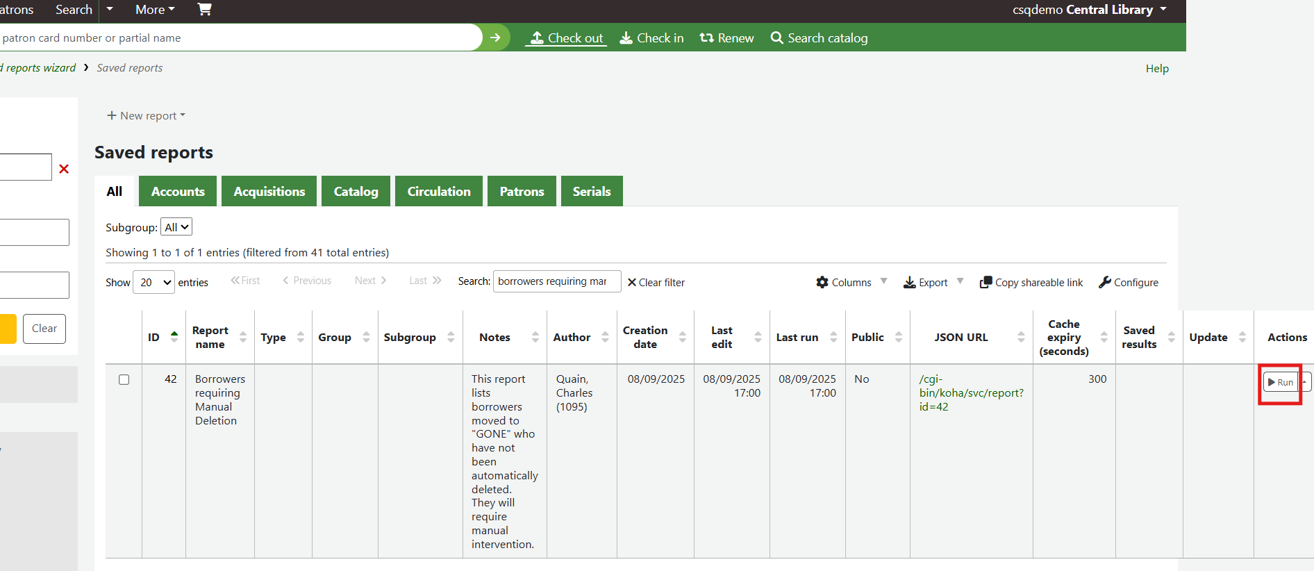 To the right hand side of the row there will be a button called Run. Click this button and the report will bring back a list of remaining borrowers in the GONE area, which are the accounts that items need to be removed from.