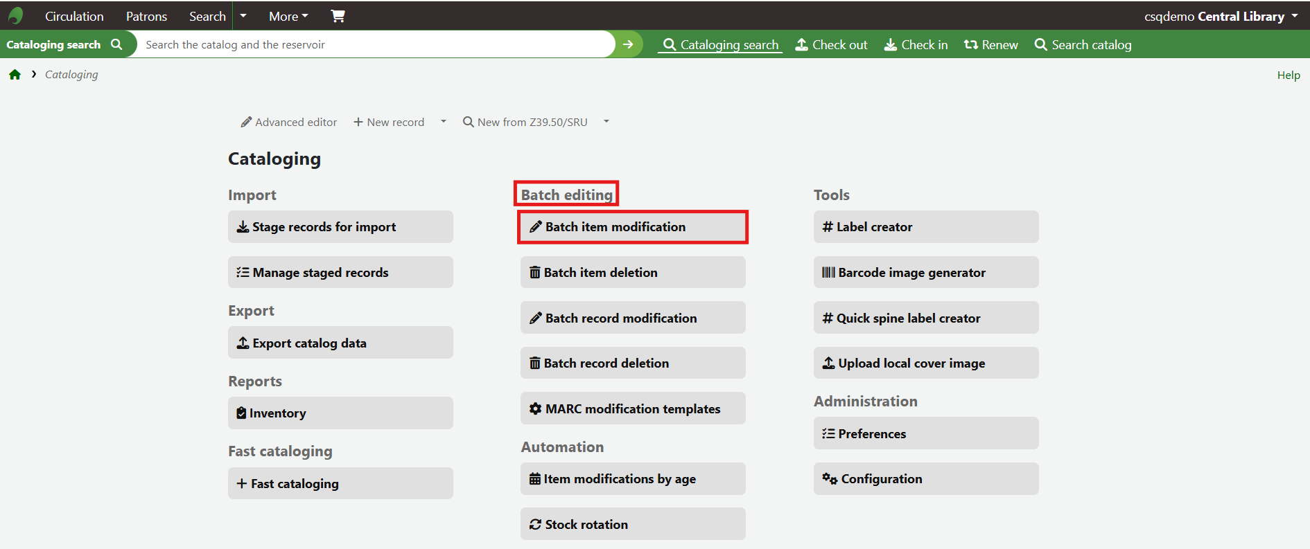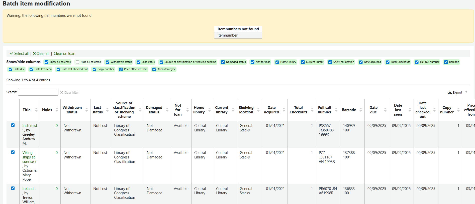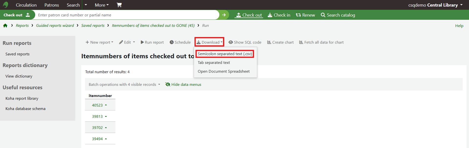 This report will bring back only the itemnumbers of the items that are checked out to GONE patrons, which is all that is needed to complete the update. Item numbers are the best option to use as they are automatically assigned by the system when a new item is created and cannot be edited. Barcodes must be manually entered and it is possible they may be edited or changed while being checked out.