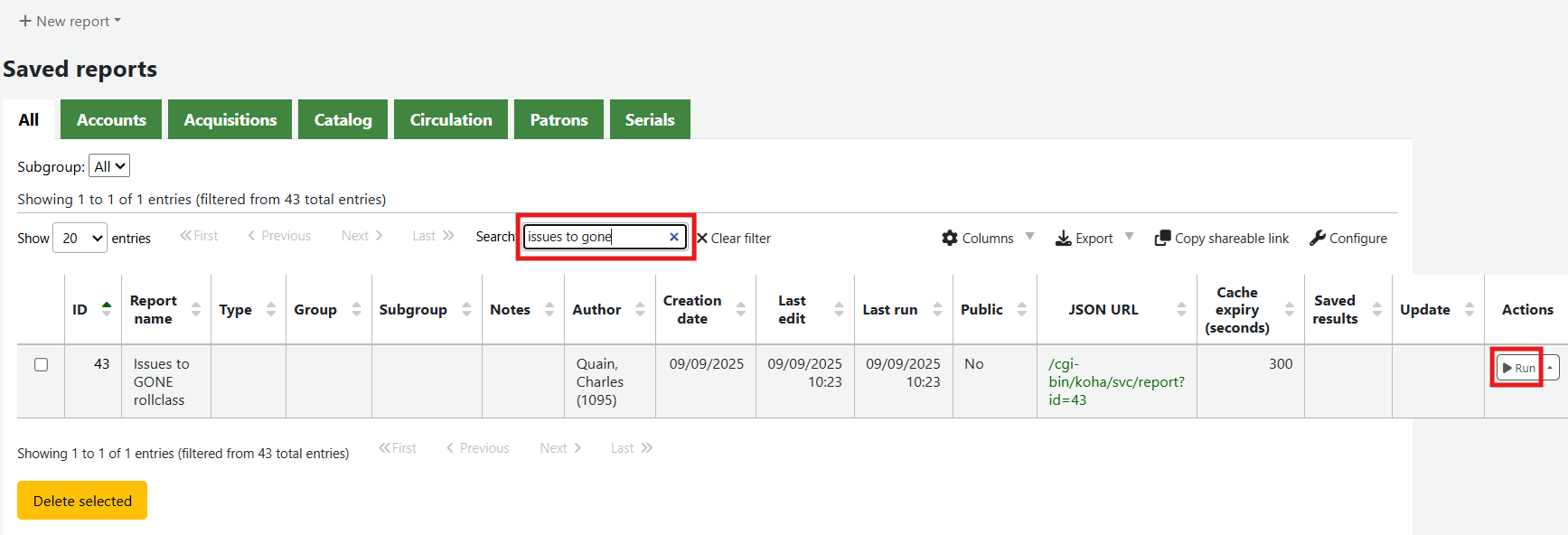 To identify the items that this status will need to be applied with go to Reports > Guided Reports > Use Saved again, but this time complete a search for Issues to GONE rollclass on the report table.