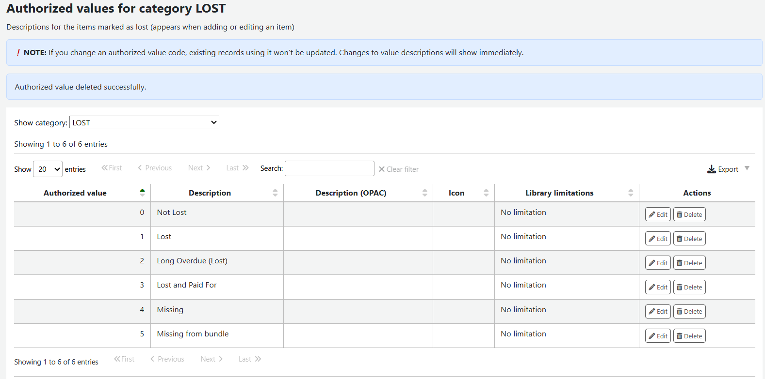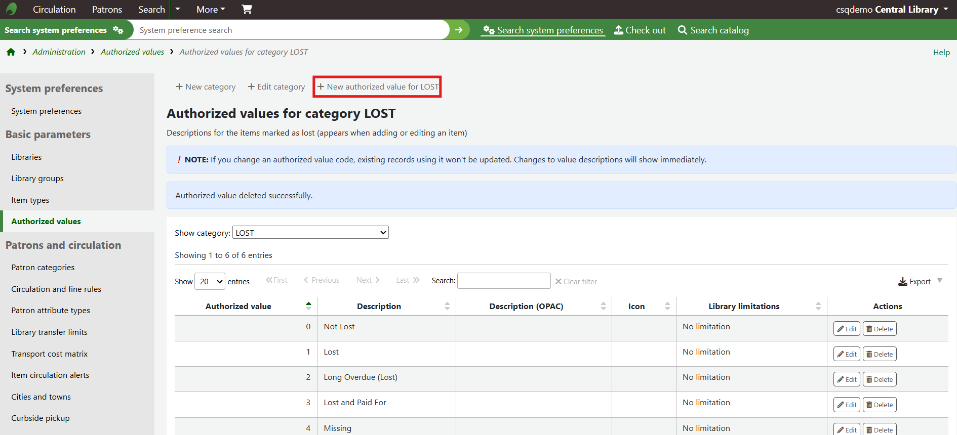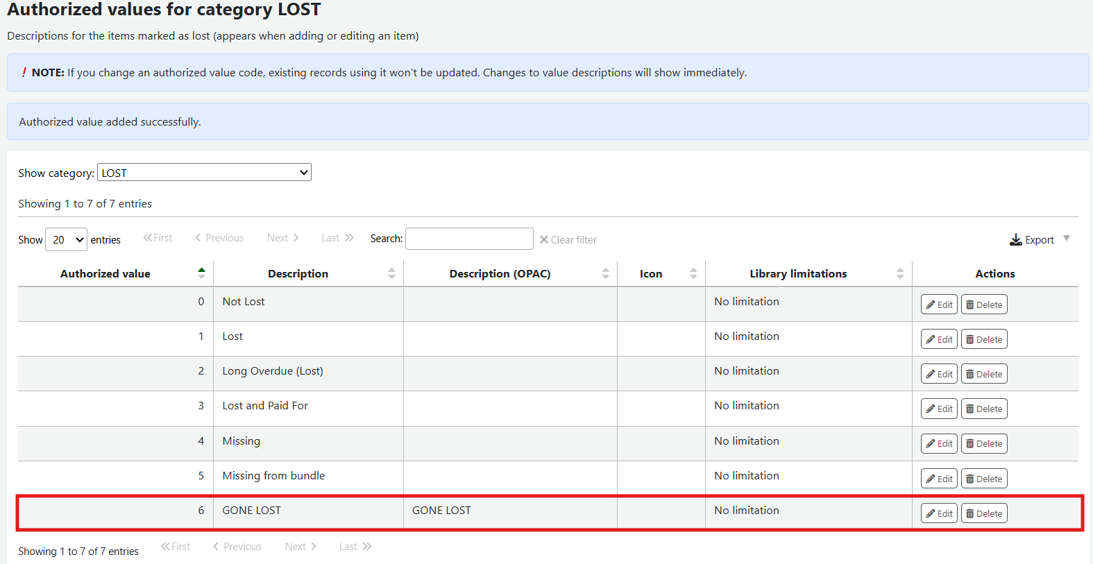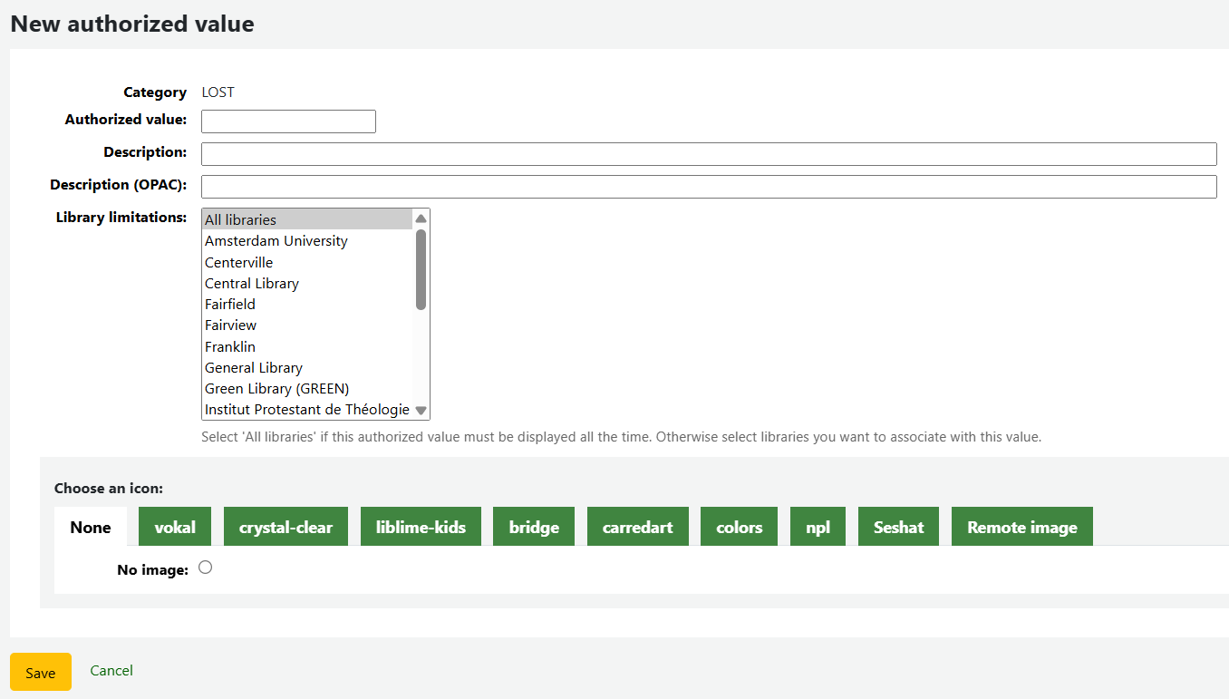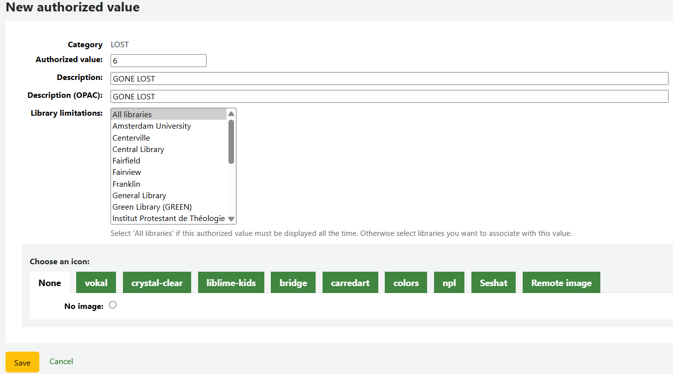 If there is no Lost value which references GONE then click on +New authorised value for LOST. This will bring you to a new page with a form to fill out.