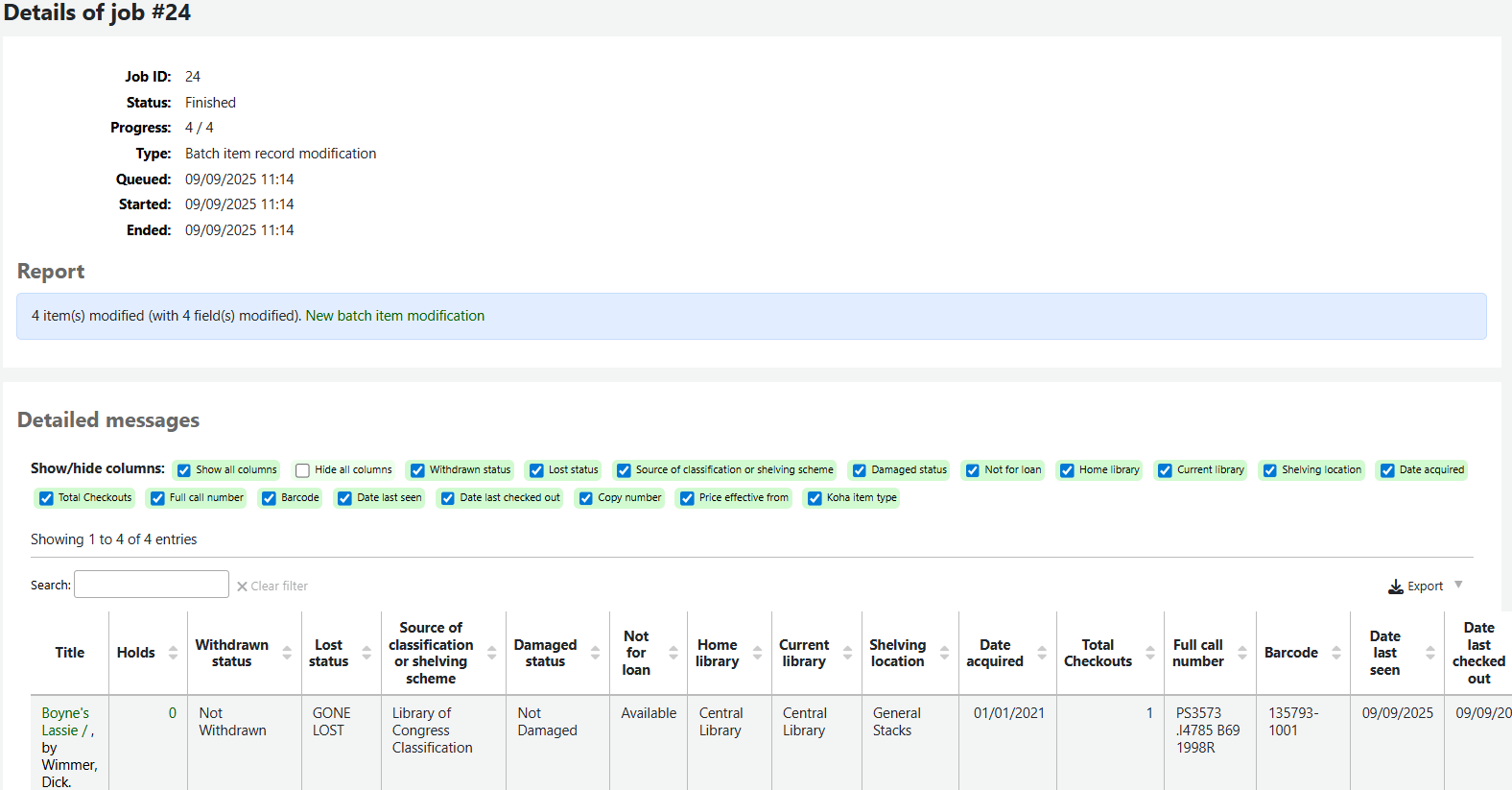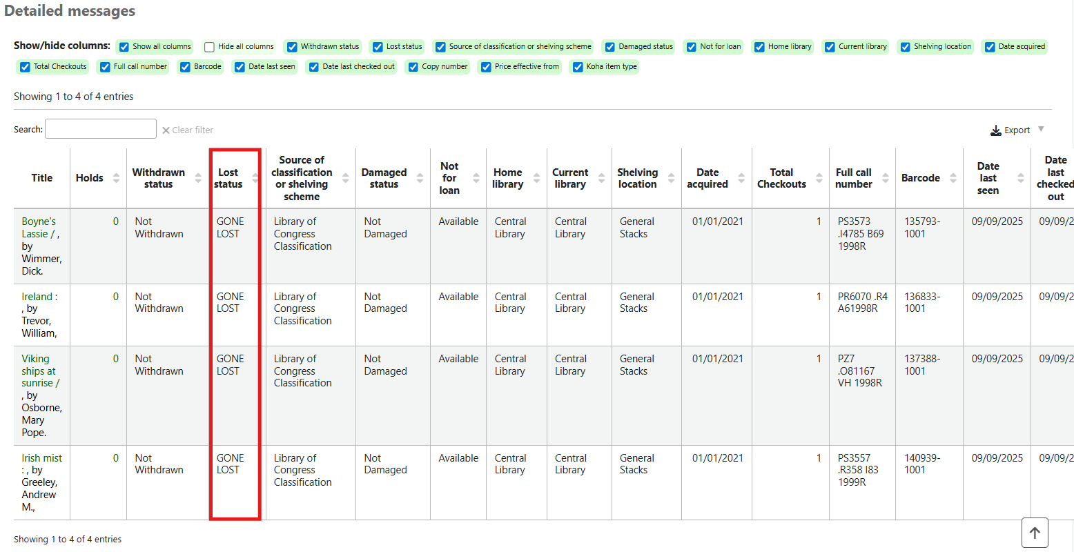 Scroll to the bottom of the page to view a table with the details of the changed items. The Lost status column should contain the GONE LOST status, or the status you changed it to.
