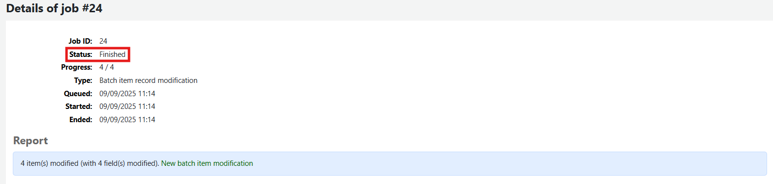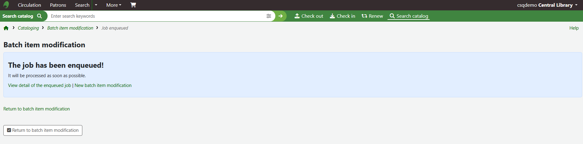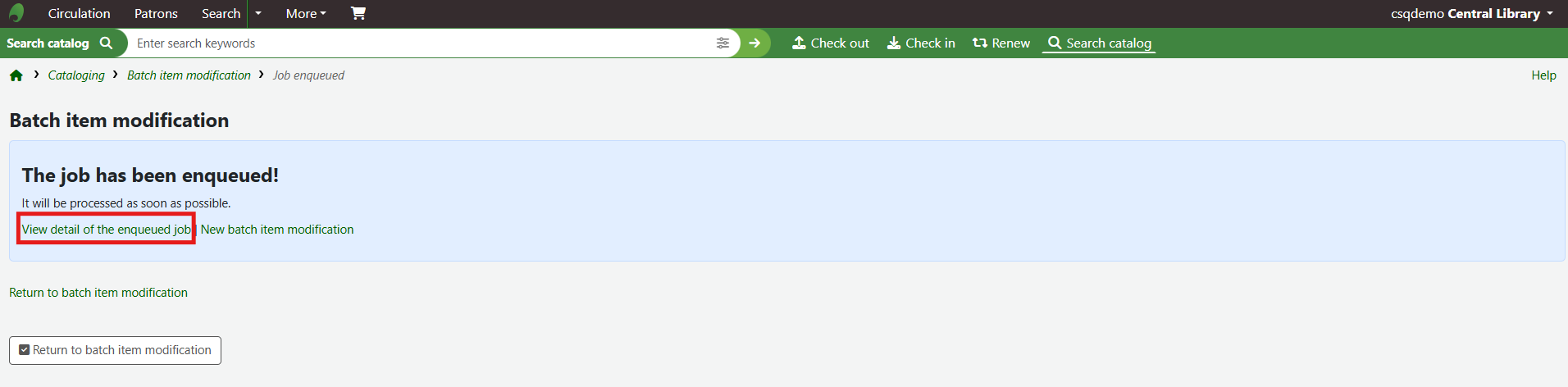 To confirm the items have been successfully updated, click the View detail of the enqueued job link.