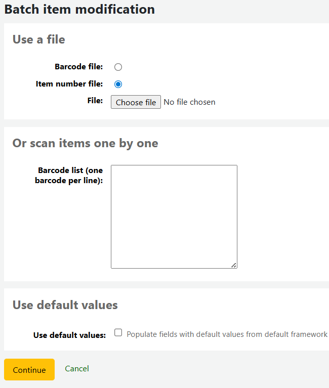 Upload the file of item numbers that were downloaded to your computer from the Itemnumbers of items checked out to GONE accounts report and hit Continue.